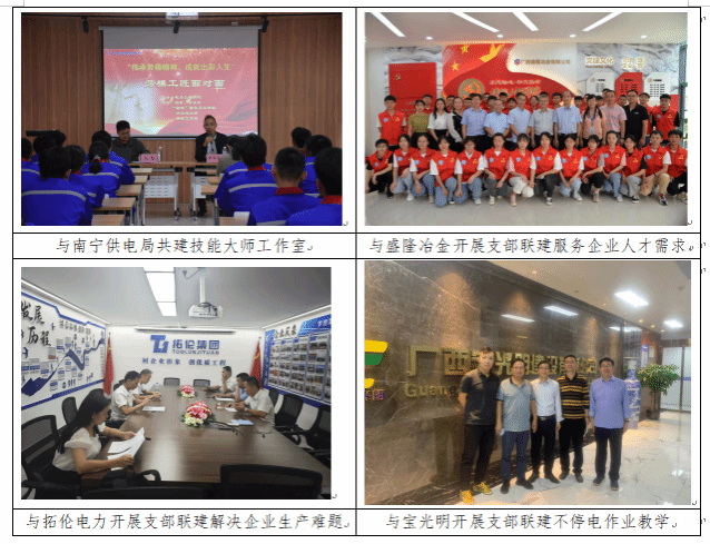 党建联建:与南宁供电局、广西拓伦电力、广西盛隆冶金等企业开展联建,联通教师高水平创新团队、企业创新工作室,与南宁供电局共建李炎、何位经技能大师工作室2个,联合企业开展智能电网和新能源消纳课题申报15项、设备工艺改进10项、技术研发8项、成果转化6项,培育新质生产力,促进绿色能源产业转型。