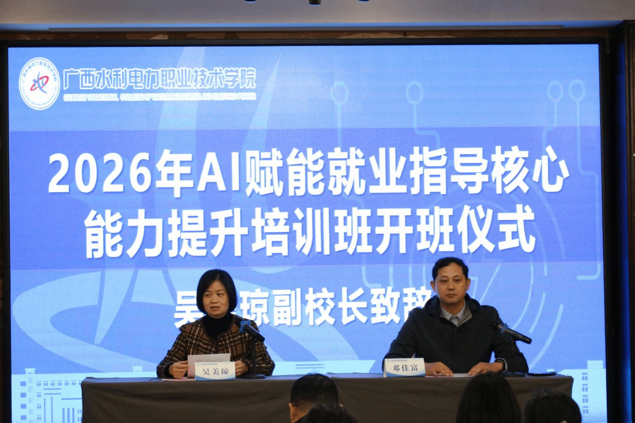 [本网讯]3月10至13日,学校招就处党支部在南宁举办2026年AI赋能职业指导核心能力提升培训班,全校54名就业指导教师参训,学校副校长吴美琼出席开班仪式并讲话,招就处处长邓佳富主持仪式。