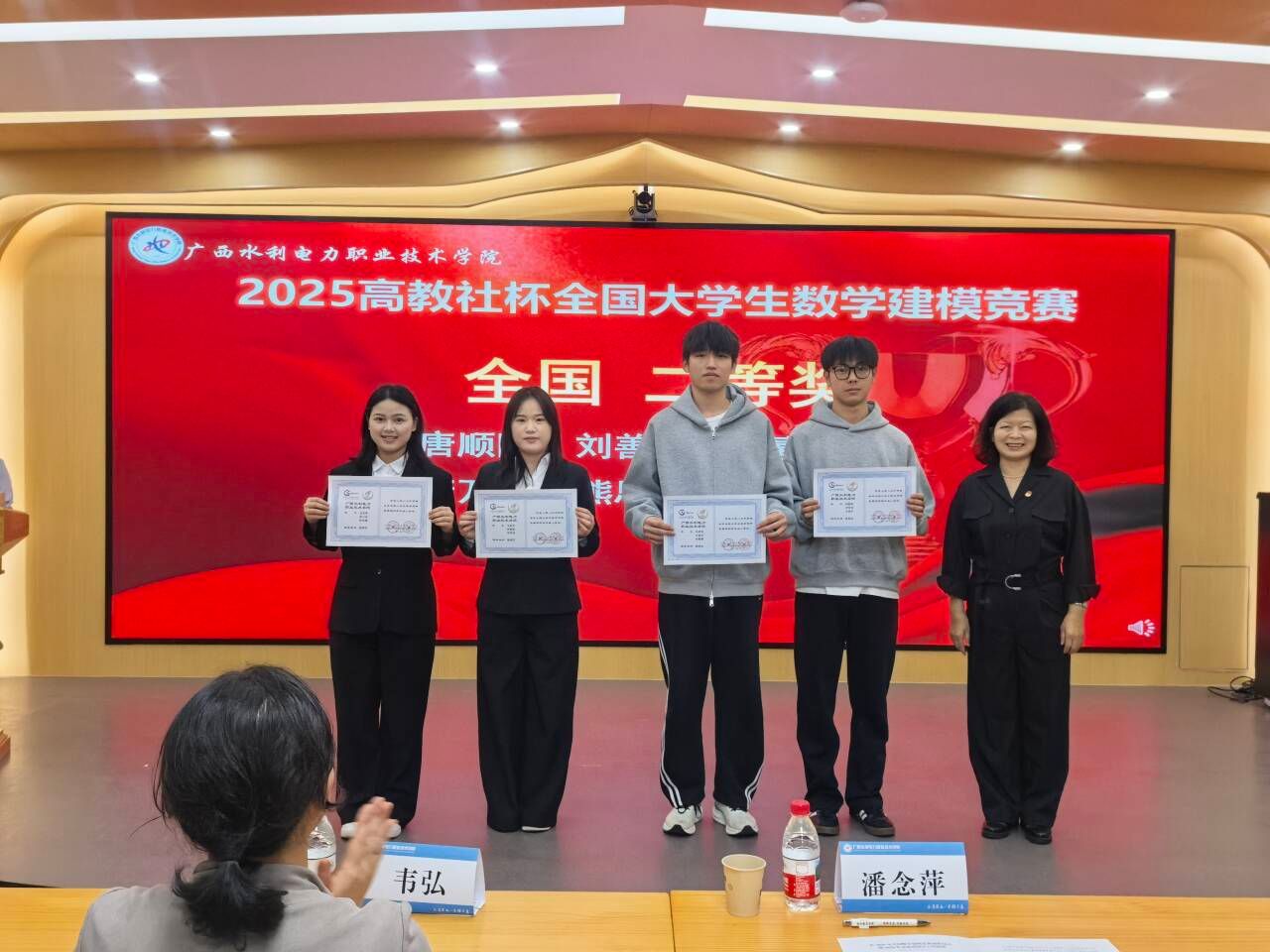 随后,潘念萍依次为获奖团队颁奖。易彦艳、唐顺隆两位全国二等奖获奖队伍学生代表分享了备赛历程与参赛心得,优秀指导教师代表吴广德就竞赛指导、团队培养作经验交流。