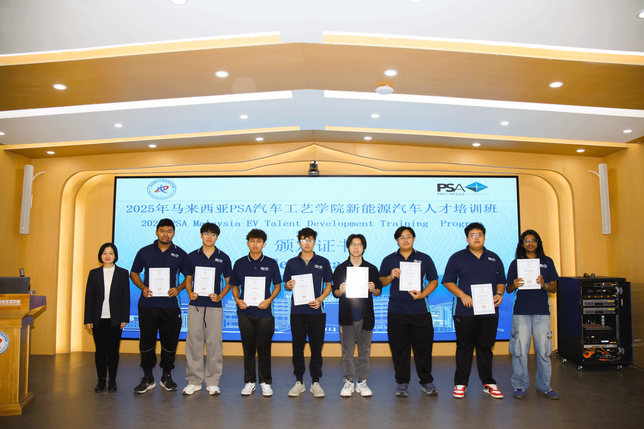 马来西亚PSA汽车工艺学院学生代表NG CHEE HIN(黄子轩)在发言中表示,此次培训不仅收获专业知识,更建立了跨文化的深厚友谊;教师代表AYYADORAI THIRUSELVAN(蒂鲁塞勒万)对我校的精心安排表示感谢,指出本次培训为马来西亚新能源汽车产业培养了力量。