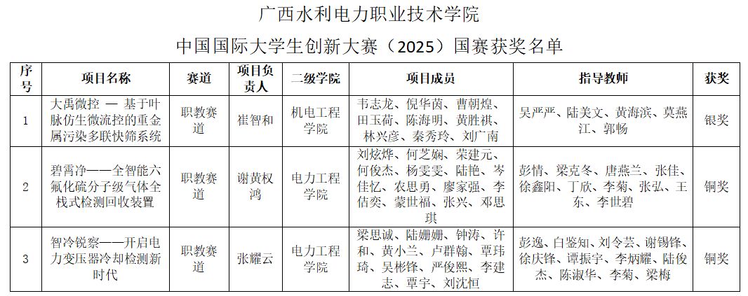 [本网讯] 近日,教育部公布了中国国际大学生创新大赛(2025)获奖名单。学校取得国赛银奖1项(广西职业院校本届赛事获得的最高奖项)、铜奖2项的优异成绩,并成为广西唯一连续五年(2021-2025年)入围全国现场总决赛的职业院校,职教赛道获奖数量在广西职业院校排名并列第一。