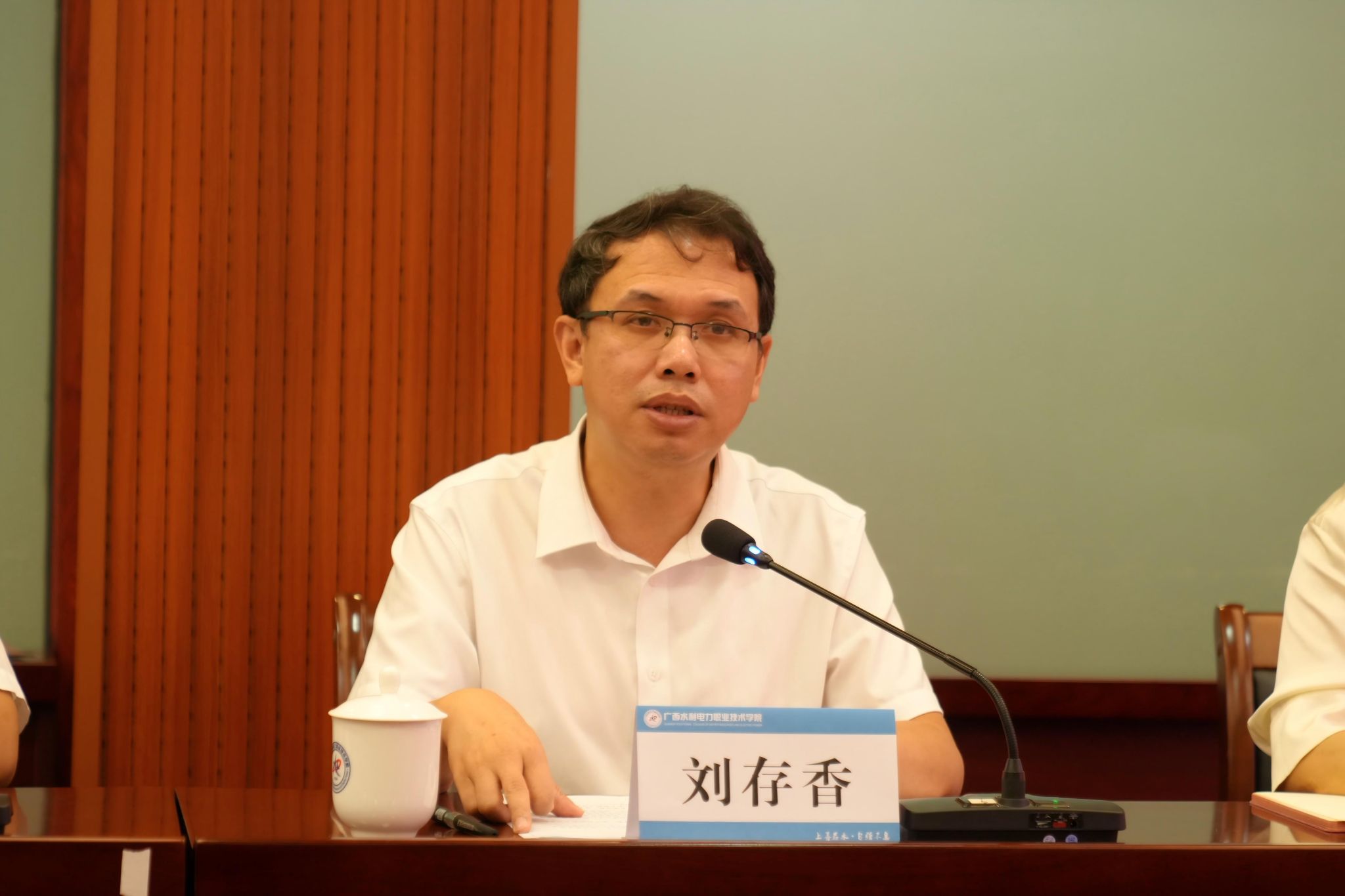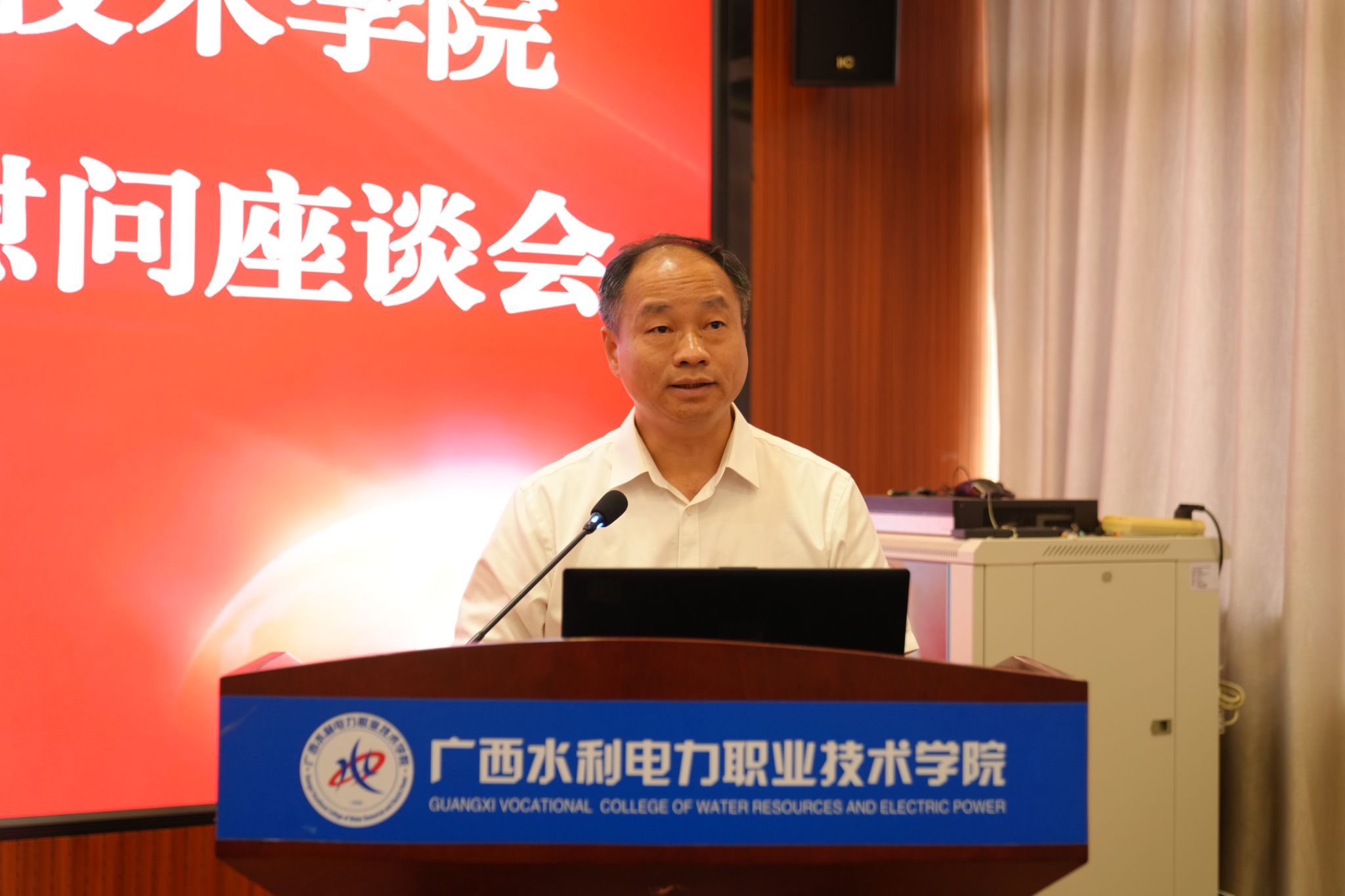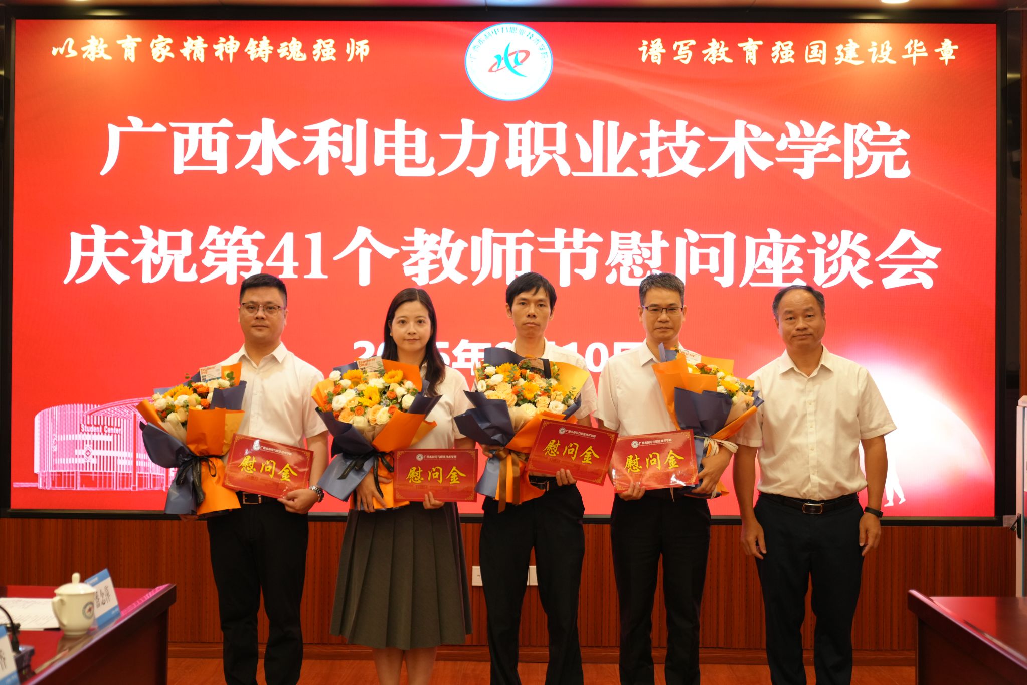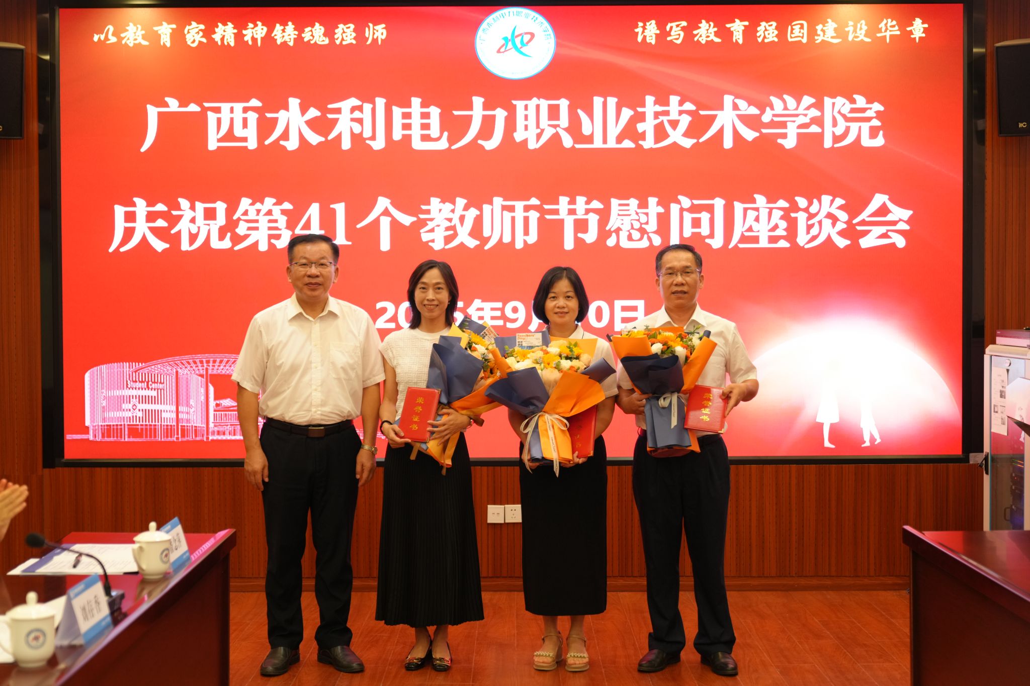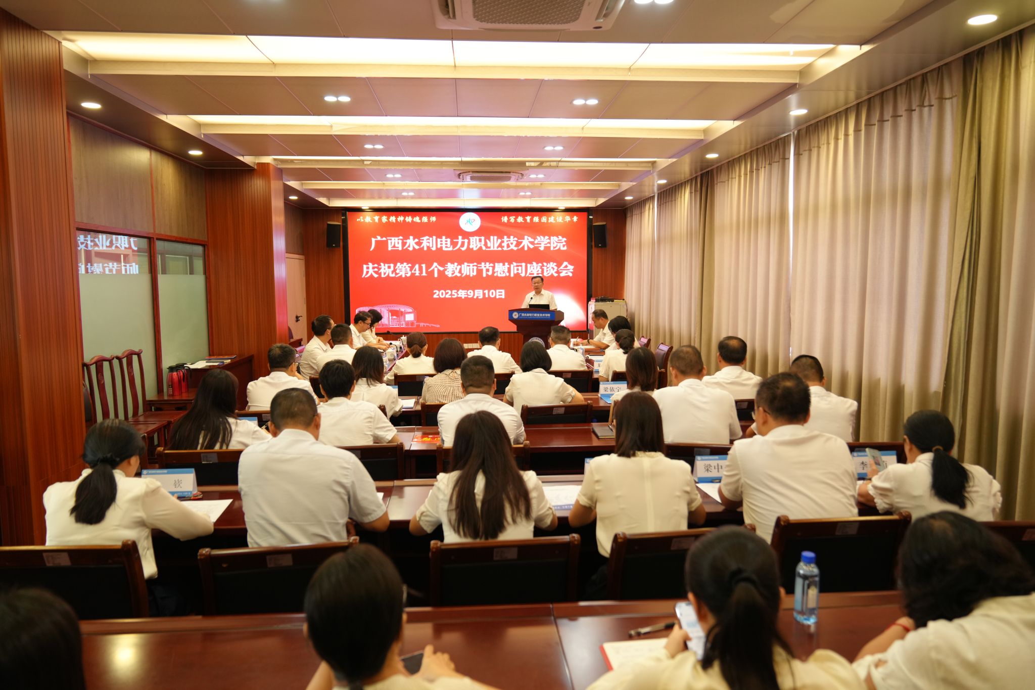 谭德伦代表自治区水利厅党组向全校教职员工致以节日的祝福,向长期躬耕于教育一线的教师们表示诚挚敬意和衷心感谢。他指出,近年来,学校紧紧围绕立德树人根本任务,在人才培养、专业建设、产教融合、社会服务等方面取得了长足进步,为全区水利系统特别是水利基层输送了一大批“下得去、用得上、干得好”的技术骨干。下一步,希望学校以“双高计划”为引领,打造水利职业教育标杆;以推动升格本科层次职业大学为契机,进一步构建水利高技术技能人才培养和服务体系;以教育家精神铸魂强师,谱写治水兴桂和教育兴桂新篇章。