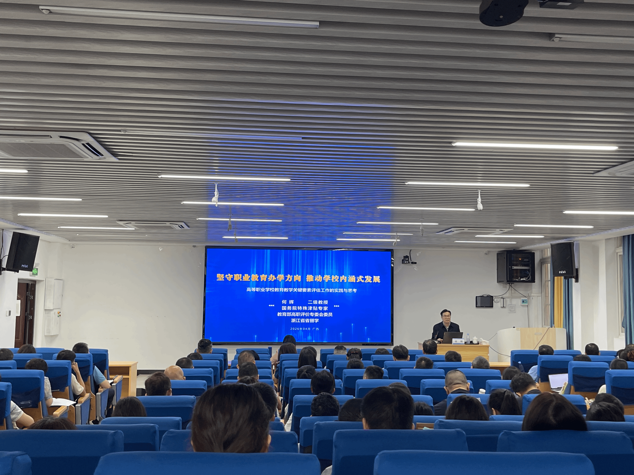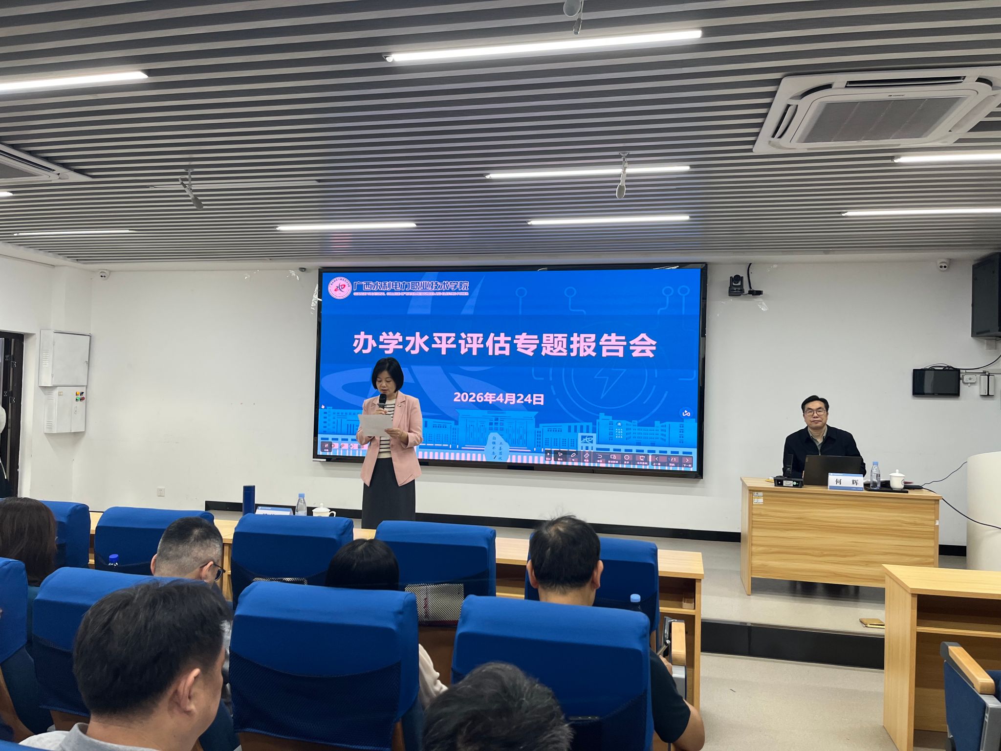 [本网讯]4月24日上午,学校在长堽校区第四教学楼1-5教室召开办学水平评估专题报告会,特邀二级教授、浙江建设职业技术学院原校长、国务院特殊津贴获得者何辉作专题辅导讲座。学校副校长吴美琼出席并主持会议。