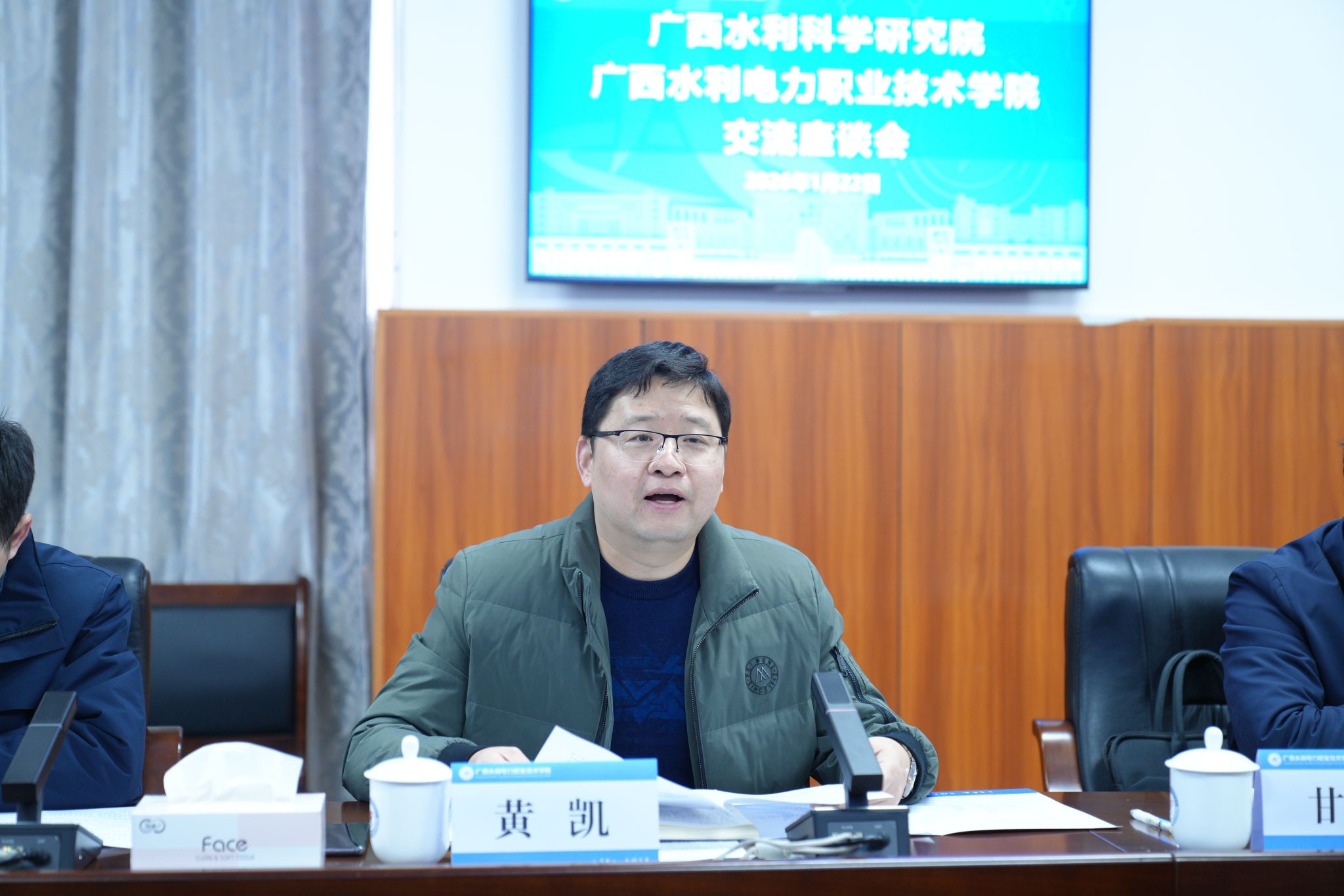 黄凯对学校的热情接待表示感谢,他结合目前广西水科院的科研项目,围绕科技项目、创新平台、人才培养、实验基地建设等方面的合作切入点进行了详细的分析,提出了推进落实的方案,期待与学校共同搭建科研平台,推动广西水利领域职业教育与科研创新协同升级,实现高质量发展。