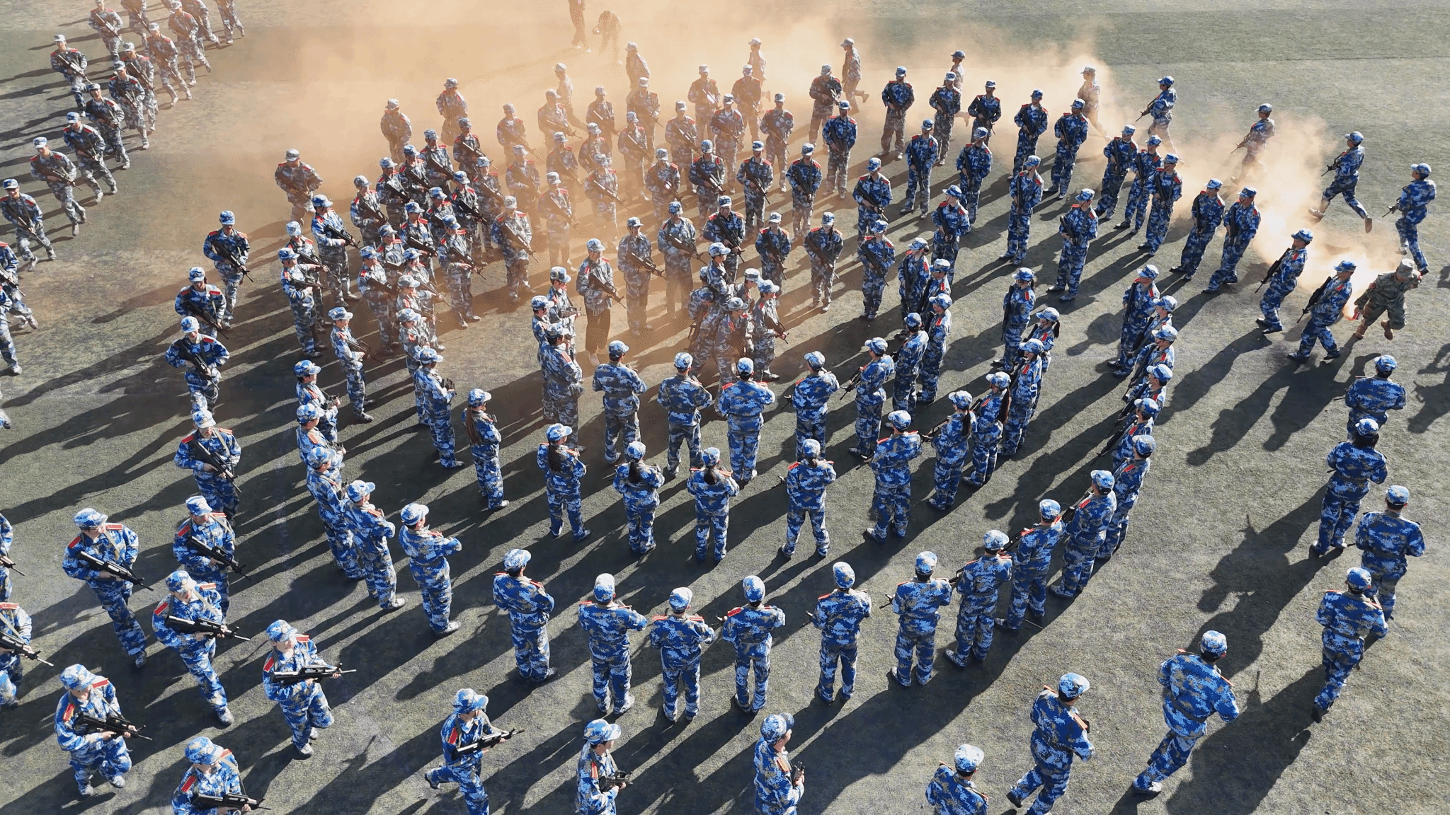 在军训成果展示环节,受训方队的同学在军训团教官的带领下进行分裂式和军事技能展示,同学们精神抖擞、步伐铿锵、动作整齐划一,以昂扬的斗志和过硬的本领,全面展示了为期14天的军事训练成果。