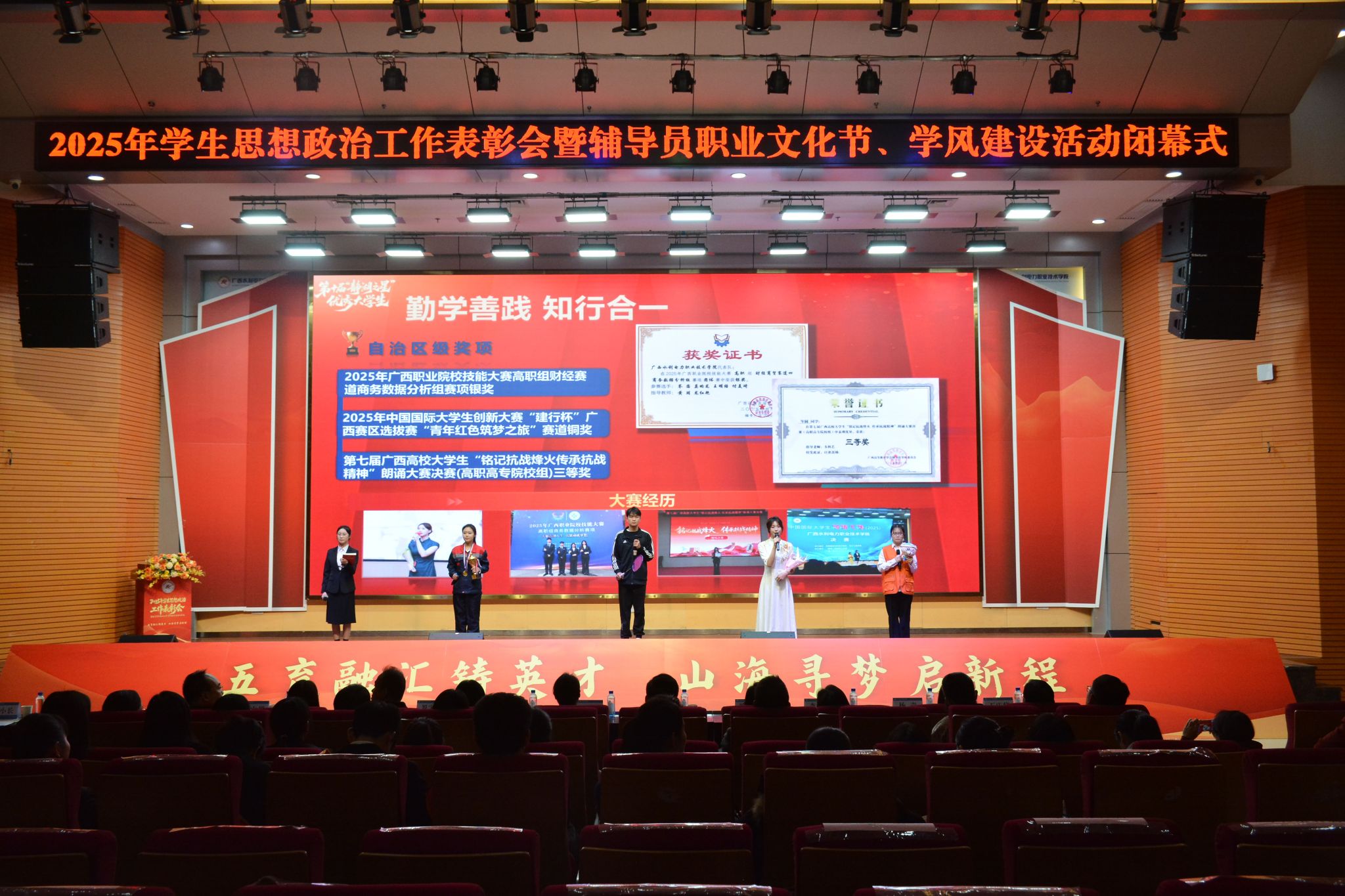 大会分为“铸基·勇立潮头”“固堤·中流击楫”“疏浚·山高水长”三个篇章,以风采展示、经验分享、颁奖表彰等形式开展,全面回顾过去一年学生工作,表彰教师、学生先进集体与个人。期间,李林为获得“2024—2025学年国家奖学金”“全国易班共建高校新媒体账号支持项目”“第十四届广西高校辅导员素质能力大赛一等奖”获奖代表颁发了荣誉证书。他鼓励全体师生,要凝聚共识、同向发力,以实干笃行的作风、挺膺奋发的姿态,将育人热情与青春力量融入办学治校各环节,汇聚起推动学校高质量发展的强大合力。