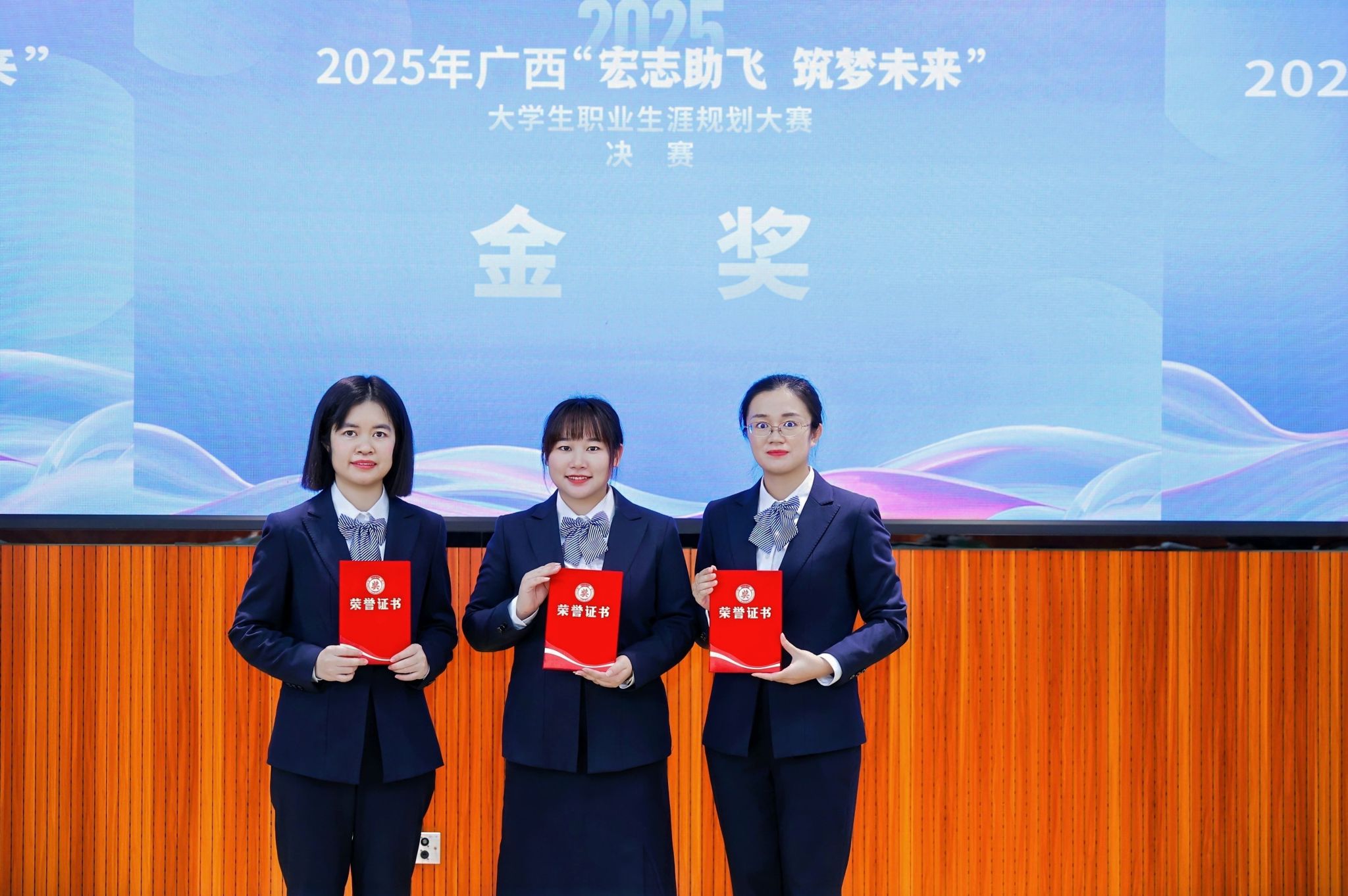 [本网讯]近日,2025年广西“宏志助飞 筑梦未来”大学生职业生涯规划大赛决赛在广西工商职业技术学院圆满落幕。我校水利工程学院教师刘丽亚、罗荣慧与党委学生工作部(学生工作处)教师潘日姣组成的参赛团队从全区各高校参赛队伍中脱颖而出,斩获教师团队赛道金奖(第一名),充分彰显了学校在党建引领下资助育人工作的卓越成效。