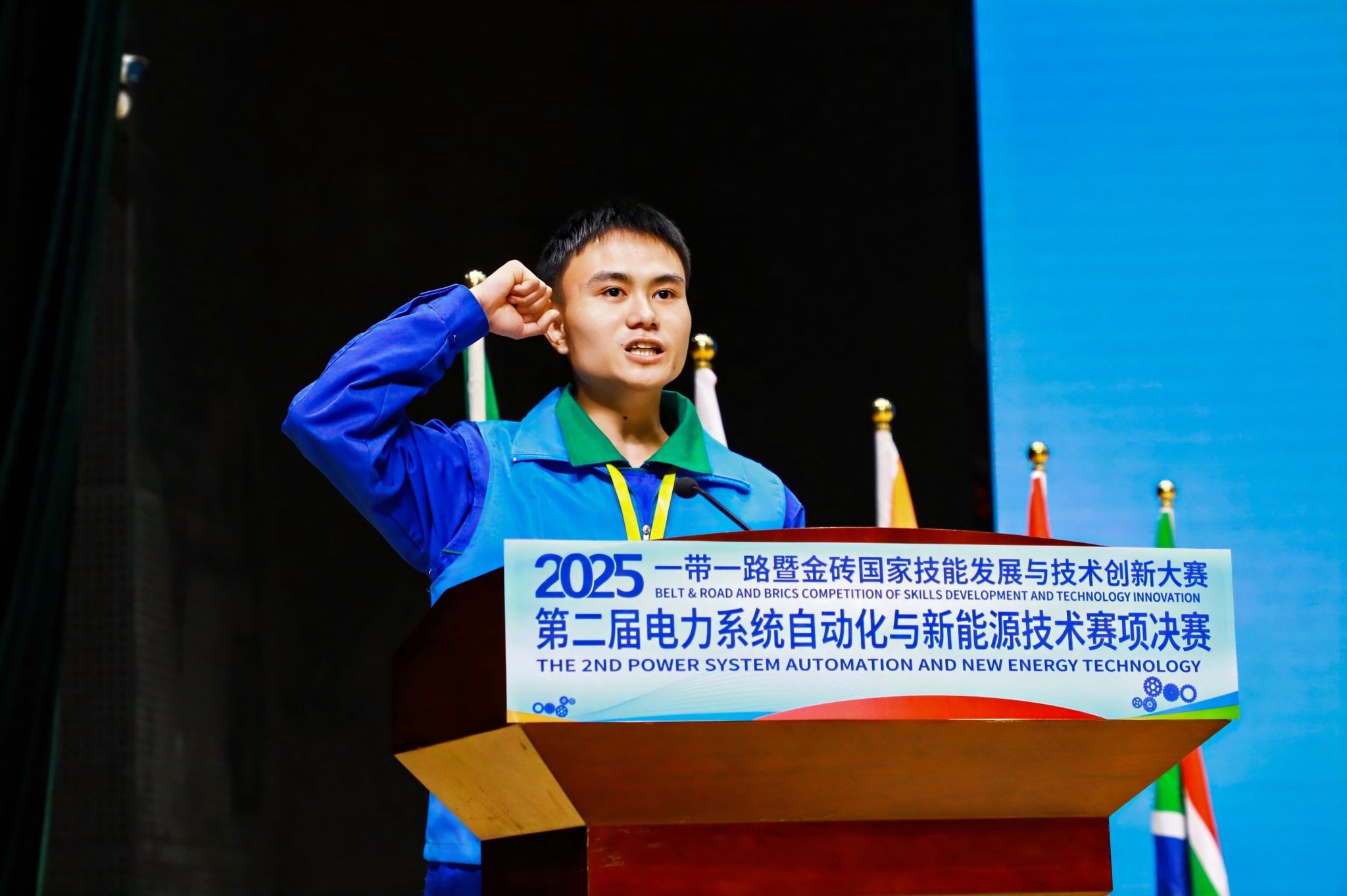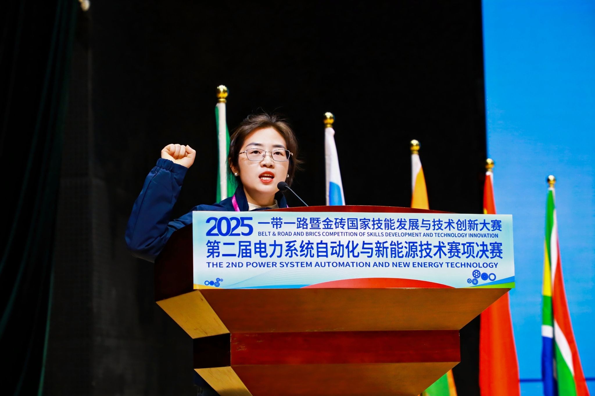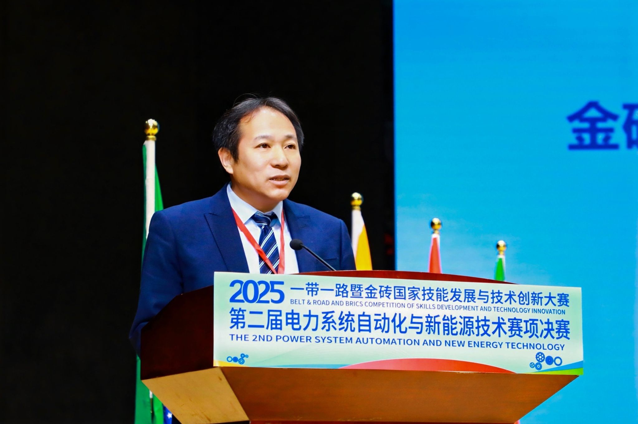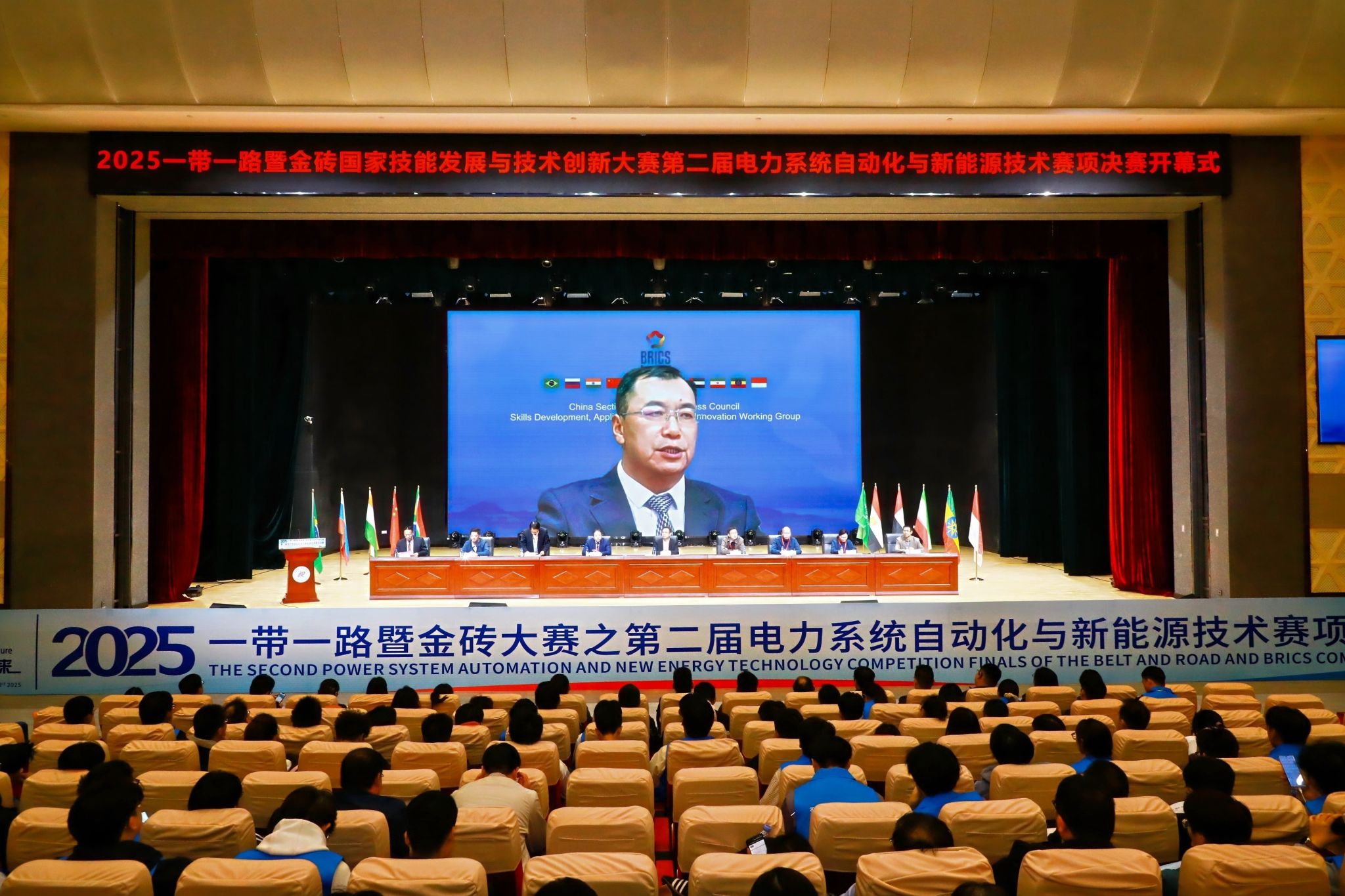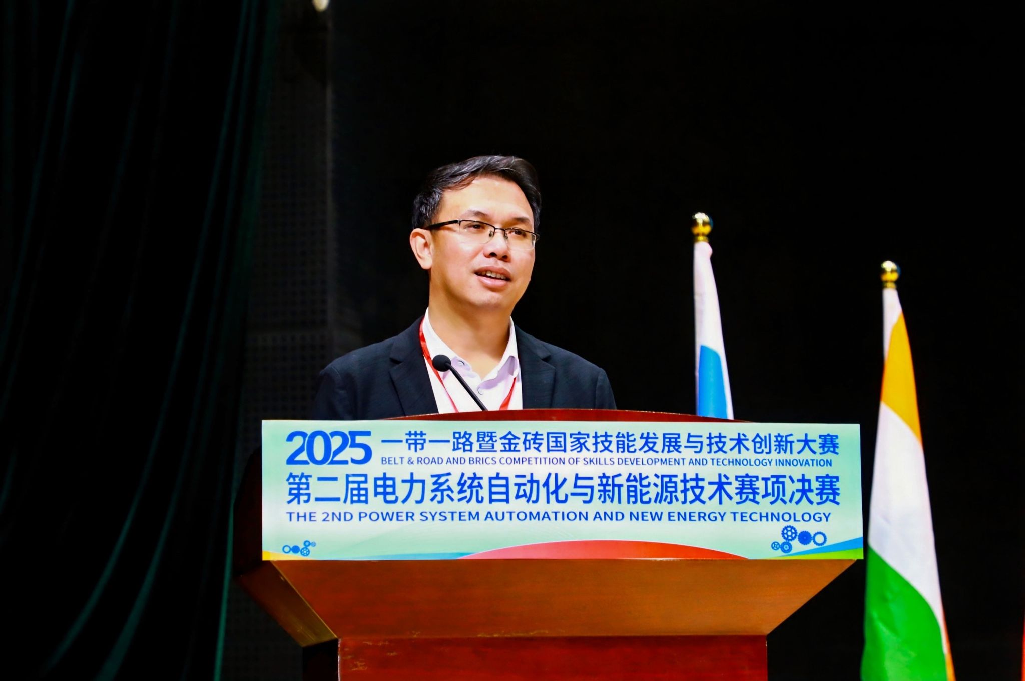 [本网讯]11月20日,2025一带一路暨金砖国家技能发展与技术创新大赛第二届电力系统自动化与新能源技术赛项决赛在里建校区顺利开幕。大赛吸引了来自全国各地院校的84支精英参赛队伍、315名师生选手同台竞技。金砖国家技能发展与技术创新大赛组委会执委会主席刘振英通过视频致开幕词,学校校长刘存香、金砖国家技能发展与技术创新大赛组委会执委会副主席何勇、河南盛世恒信科技有限公司总经理高向前出席开幕式现场,开幕式由学校副校长周涛主持。