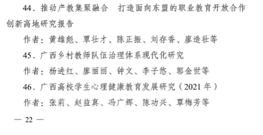 学校校长刘存香参与完成的《推动产教集聚融合 打造面向东盟的职业教育开放合作创新高地研究报告》,党委学生工作部(学生工作处)陈功兴参与完成的《广西高校学生心理健康教育发展研究(2021年)》分别围绕职业教育开放创新、高校学生心理健康教育状况与发展等内容进行探讨,并结合我区实际提出了建设性的对策和建议。学校教师积极参与跨单位合作研究,主动为广西哲学社会科学高质量发展贡献智慧和力量。
