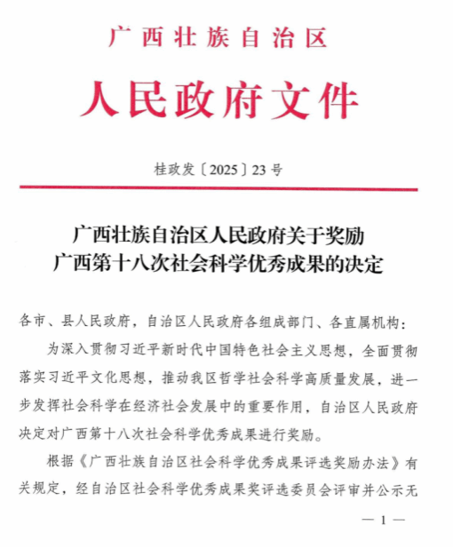 [本网讯]根据《广西壮族自治区人民政府关于奖励广西第十八次社会科学优秀成果的决定》(桂政发〔2025]23号),学校教师参与的2项成果获得研究报告类成果二等奖。