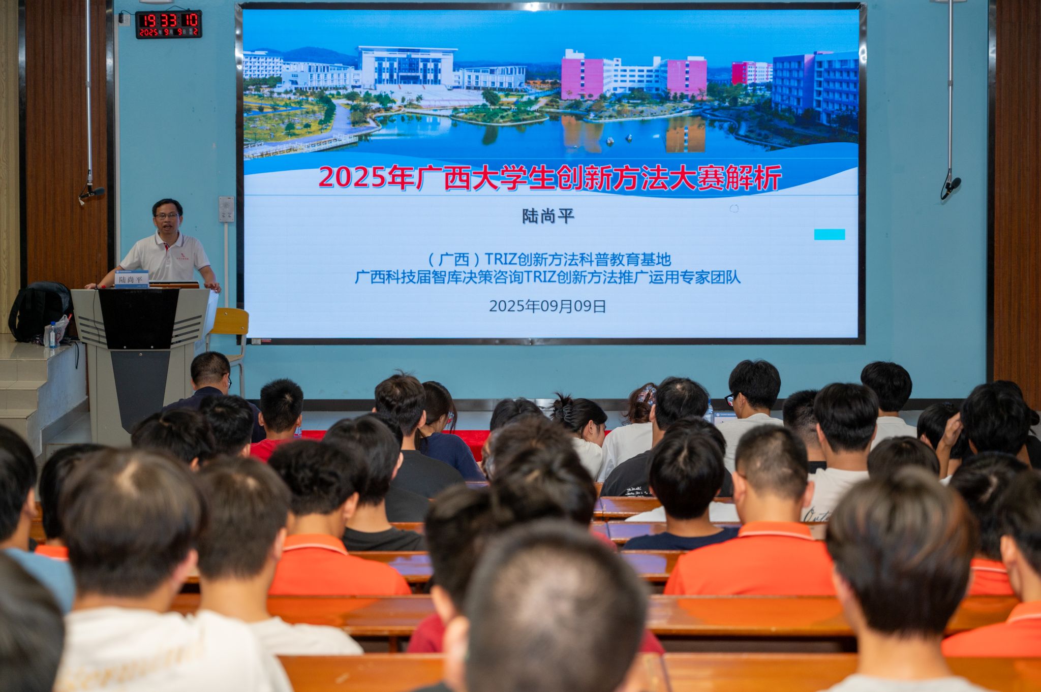 [本网讯]为进一步提升我区学生对科技创新方法的理解和应用,深化对创新实践的认识和技能,同时为即将举办的2025年广西大学生创新方法大赛做充分准备,学校于9月9日晚在里建校区教学楼阶梯101教室成功举办2025年广西大学生创新方法大赛宣讲会。广西TRIZ创新方法推广运用首席专家、机电工程学院院长陆尚平博士担任宣讲会主讲人。