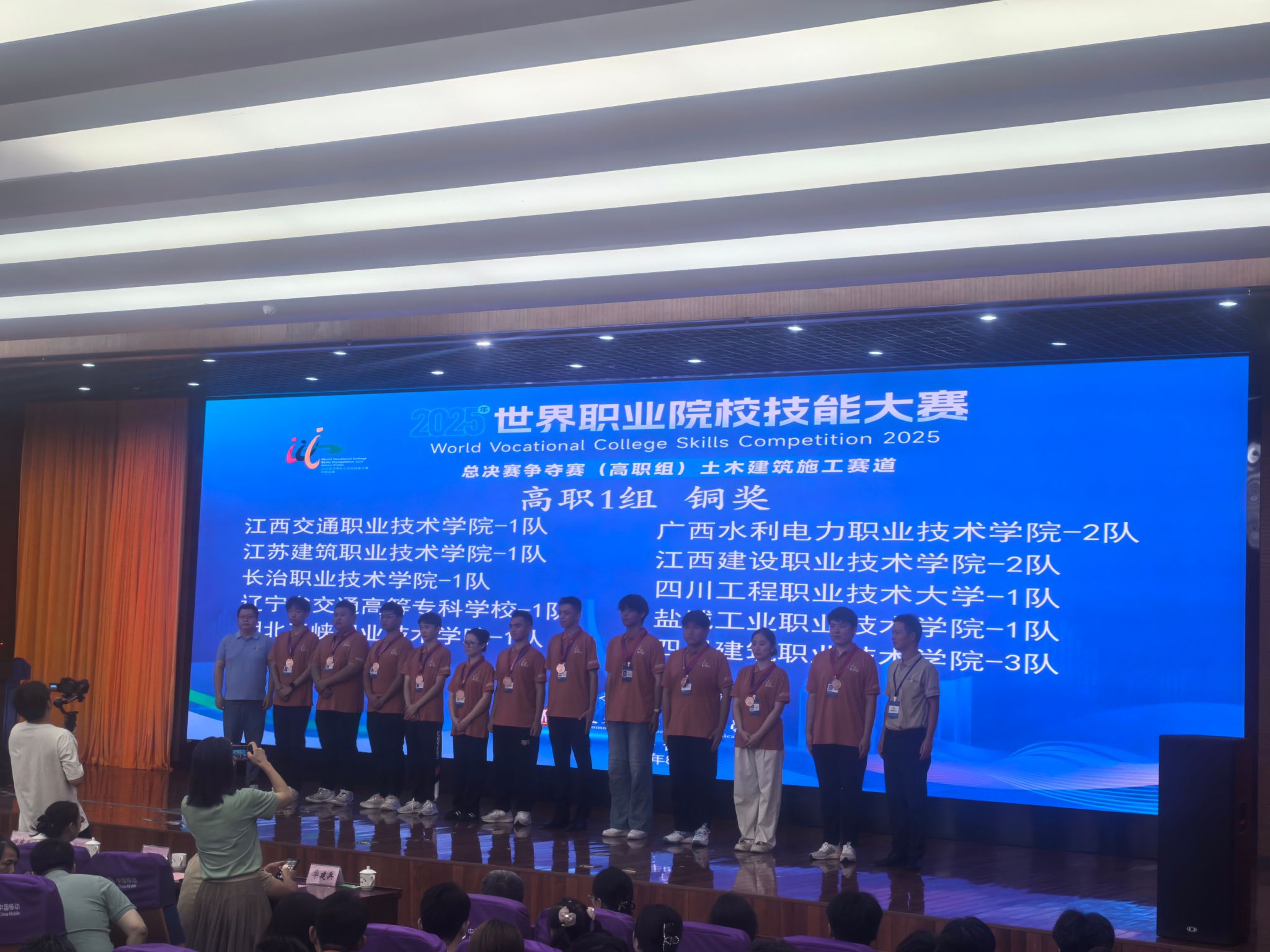 [本网讯]8月31日,2025年世界职业院校技能大赛总决赛争夺赛“土木建筑施工”赛道(高职组)在安徽职业技术大学圆满落幕。土木建筑工程学院参赛选手毛裕祺、廖一鸣、陈静洁在黄怡健、刘波、黄文杰等老师的悉心指导下,团结协作、敢打敢拼、奋勇争先,最终凭借扎实的专业技能和出色的现场表现,荣获大赛铜奖!