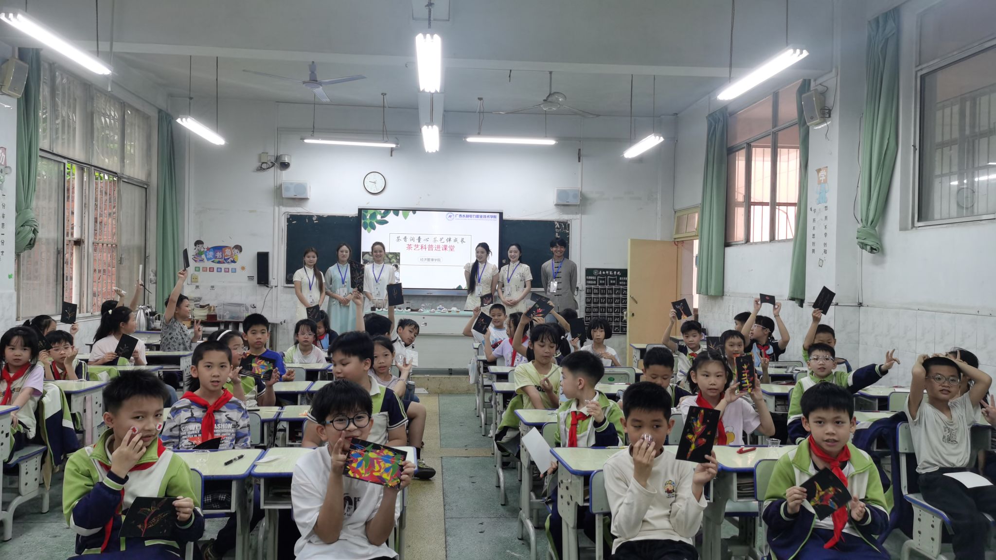 本次40分钟科普课堂由茶艺协会学生陈慧灵主讲,围绕茶文化、茶品类、茶艺体验、识茶品茶四大内容展开,理论讲解与互动实践有机结合。课堂上,陈慧灵生动讲述茶文化的起源与发展,带领孩子们认识绿茶、红茶、乌龙茶等常见茶类;通过实物辨茶、刮画创作、品茶体验等趣味环节,让孩子们在动手实践中感受茶的魅力,学习基本茶礼。