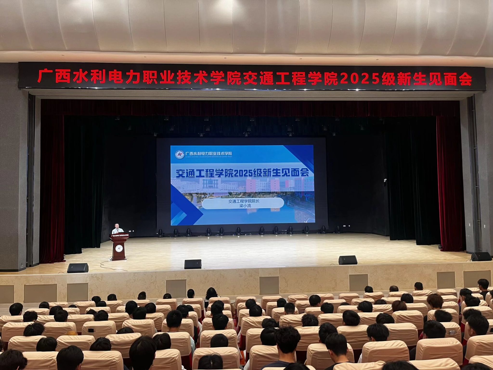 见面会在庄严的国歌声中拉开帷幕,全体师生肃立齐唱,爱国情怀在激昂旋律中悄然流淌。随后,交通工程学院院长梁小流致辞。作为大学旅程的同行者和守护者,梁小流深入阐述了汽车行业的广阔前景与发展机遇,结合学院专业特色与行业趋势,为新生的人生“新枢纽”指明了方向,不仅帮助大家明晰专业目标,更坚定了他们投身我国汽车产业的决心。