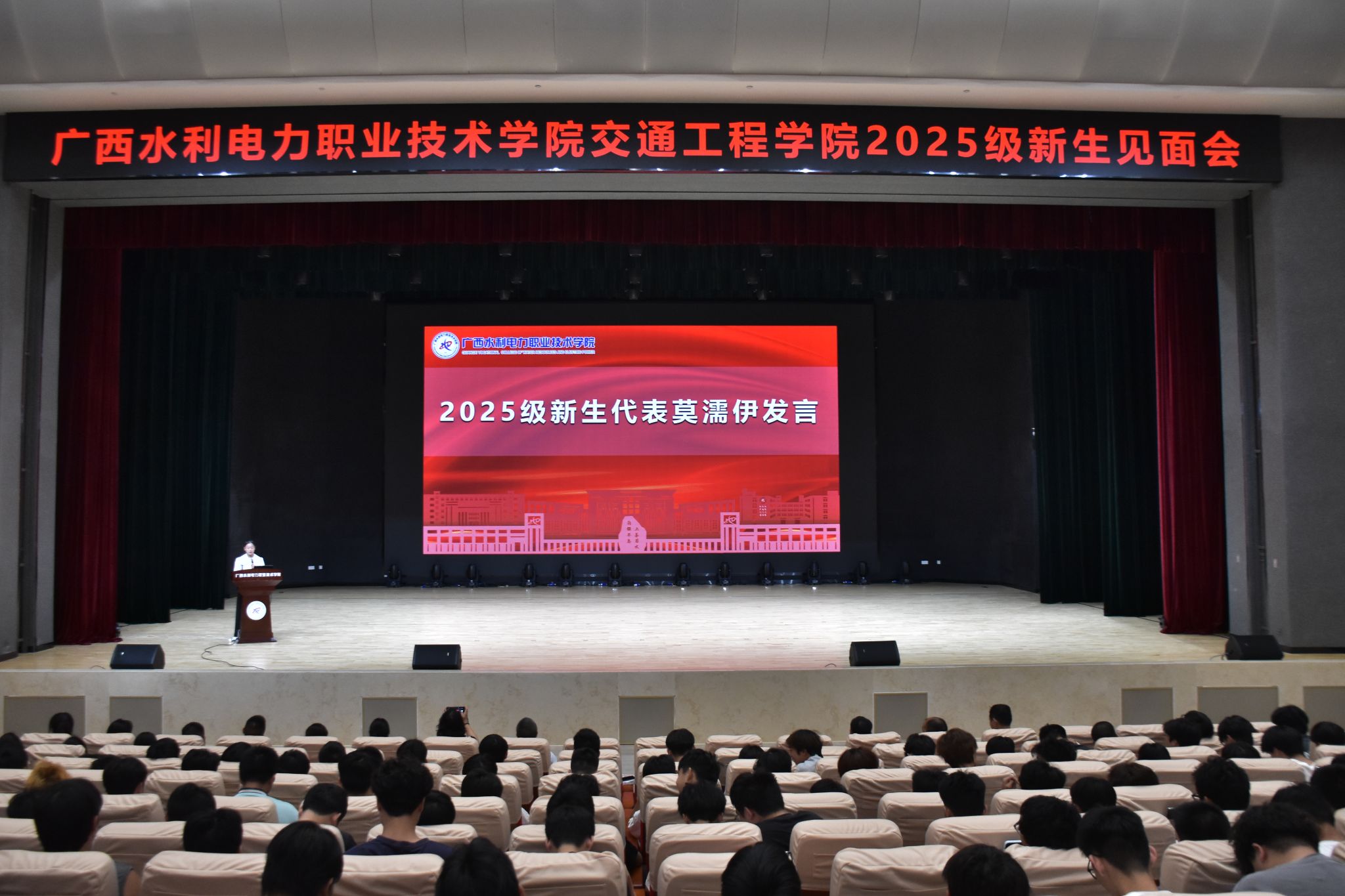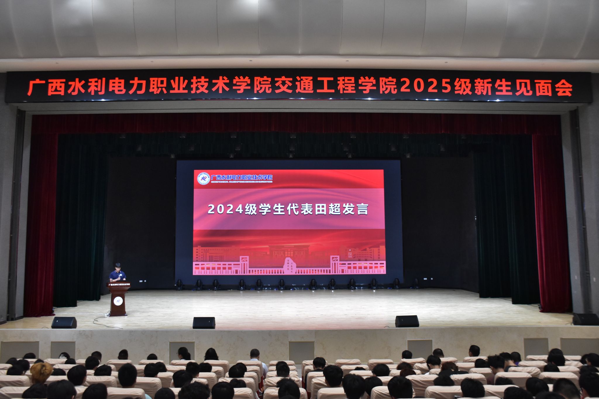 学长经验分享环节为新生提供了切实可行的指引。2024级学生田超作为老生代表,结合自身求学经历,分享了大学“交通人生”的体会——从专业学习方法到校园生活适应,内容详实、贴近实际,助力新生更具体地规划大学生活。新生代表莫濡伊则展现出2025级学子的蓬勃朝气与坚定信念,她抒发了对大学生活的美好期待,表达了勤学笃行、传承优良学风的决心,赢得现场师生的热烈掌声。