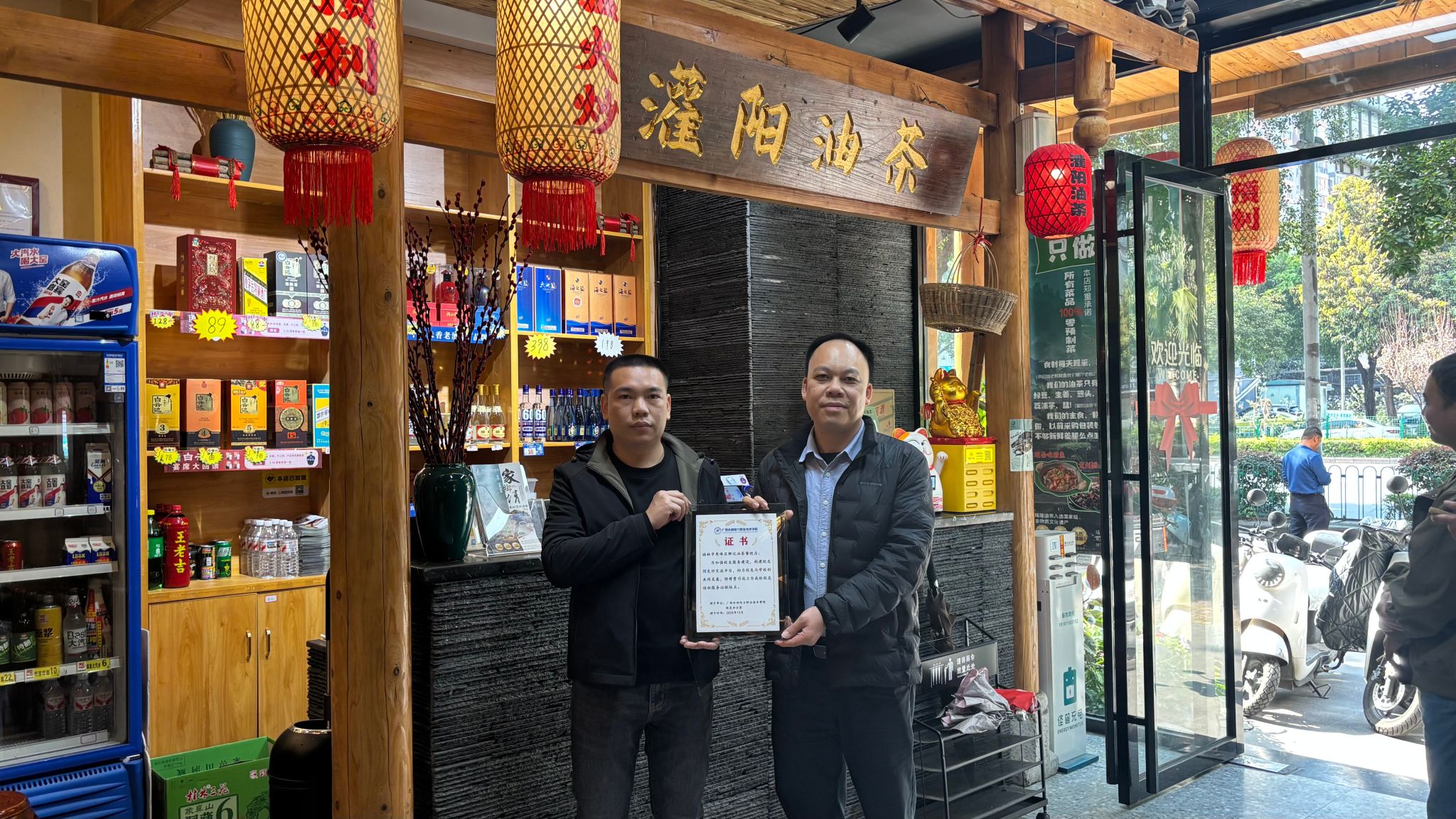 调研小组还走访了校友卿荣杰自主创办的桂林市秀峰区卿记油茶餐饮店,了解其创业历程并授予“校友桂林服务站联络点”证书。