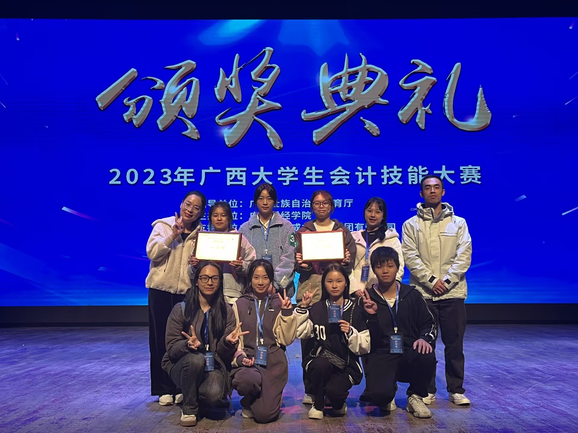 12月3日,由广西财经学院主办,由广西壮族自治区教育厅指导的2023年广西大学生会计技能大赛圆满落幕,来自广西各地23所高职院校的42支代表队展开了激烈角逐。我校经济管理学院周燕玲、郭嘉坚两位老师指导的覃正侣、李艺梅、何佩穗、王紫依、陈春媛、甘佳田、晏华梅、高广奇八位同学分成两组参加比赛,经过4个小时的鏖战,在强手如林的激烈角逐中脱颖而出,荣获团体一等奖1项、二等奖1项。