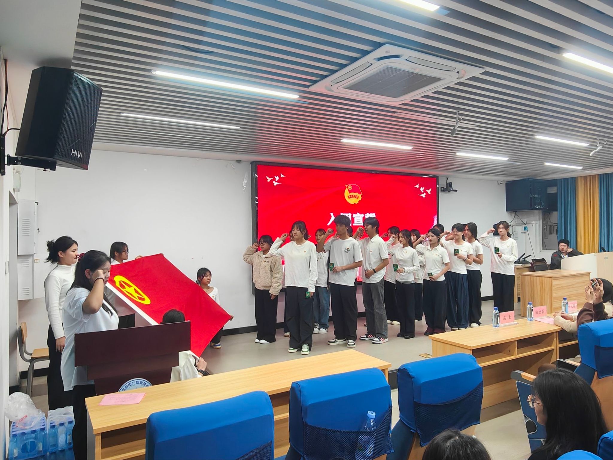 随后,主持人宣读新团员名单,教师代表与老团员代表依次为新团员佩戴团徽、颁发团员证。新团员在领誓人的带领下庄严宣誓,并郑重表示将以团员标准严格要求自己,用实际行动践行铮铮誓言。优秀团员代表也上台分享感悟,鼓励新团员在团组织中勤学善思、勇担使命。