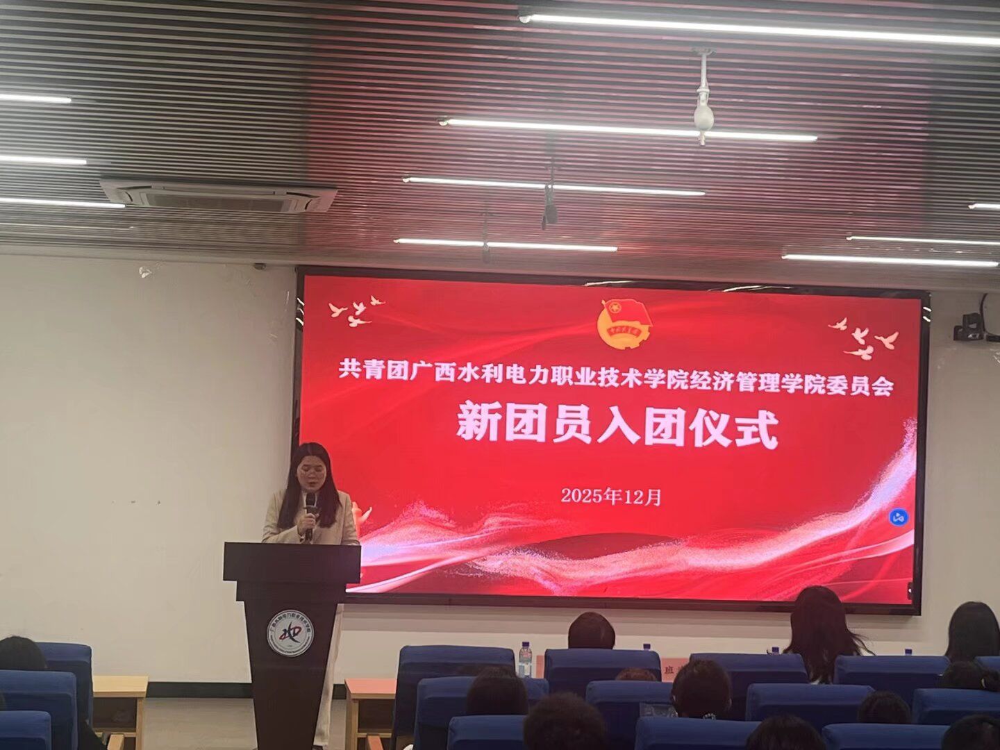 [本网讯]为强化新团员的责任担当与使命意识,12月29日晚,经济管理学院在第四教学楼105报告厅顺利举行新发展团员入团仪式,学院党总支书记班兰美、团委书记冯文、团委副书记刘义蕾、心理辅导站站长韦秋艺以及25级各班团员代表与院团委学生会组织部共同参与见证。