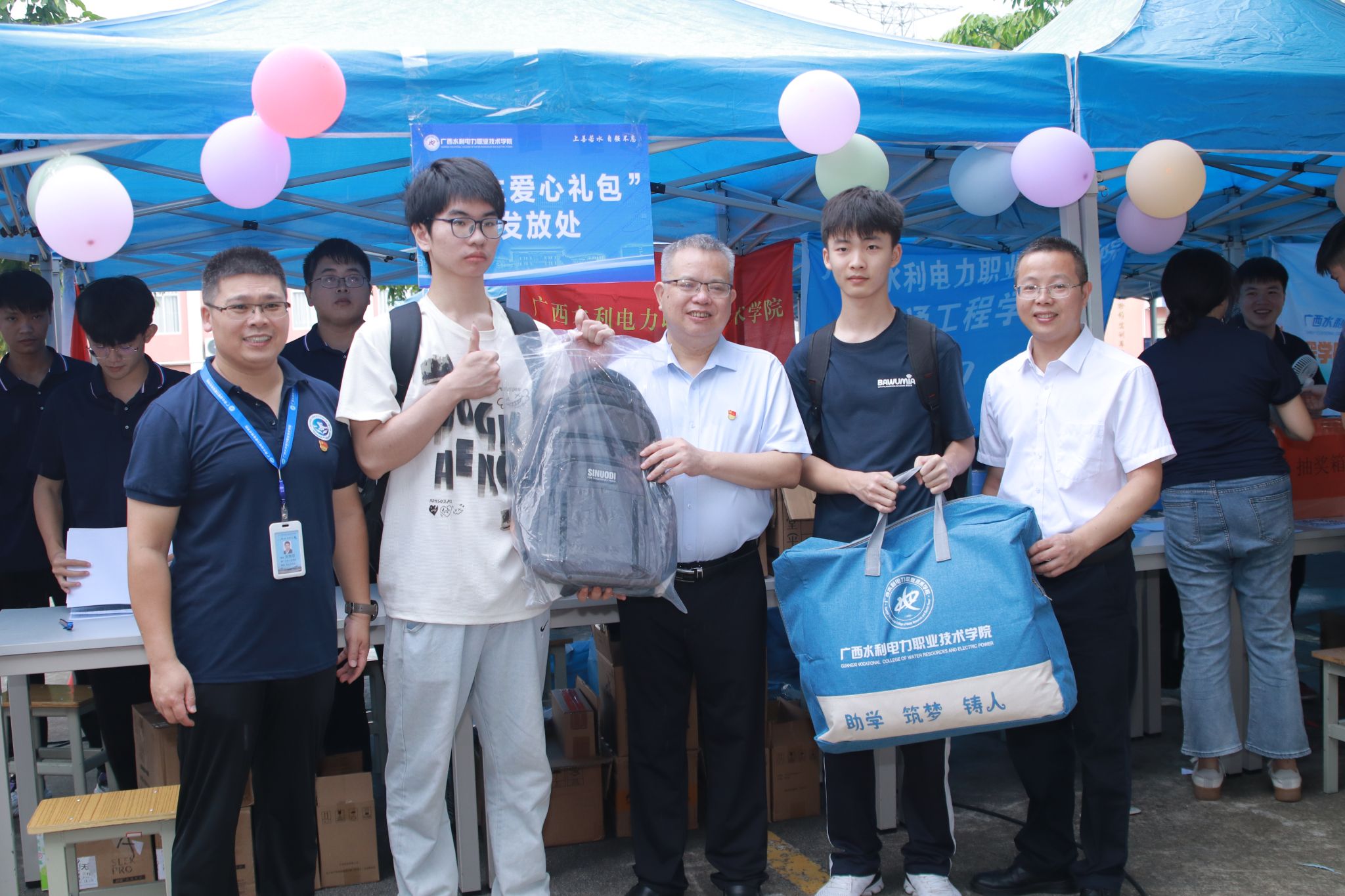 学校副校长蒋文沛给学生发放新生爱心大礼包
