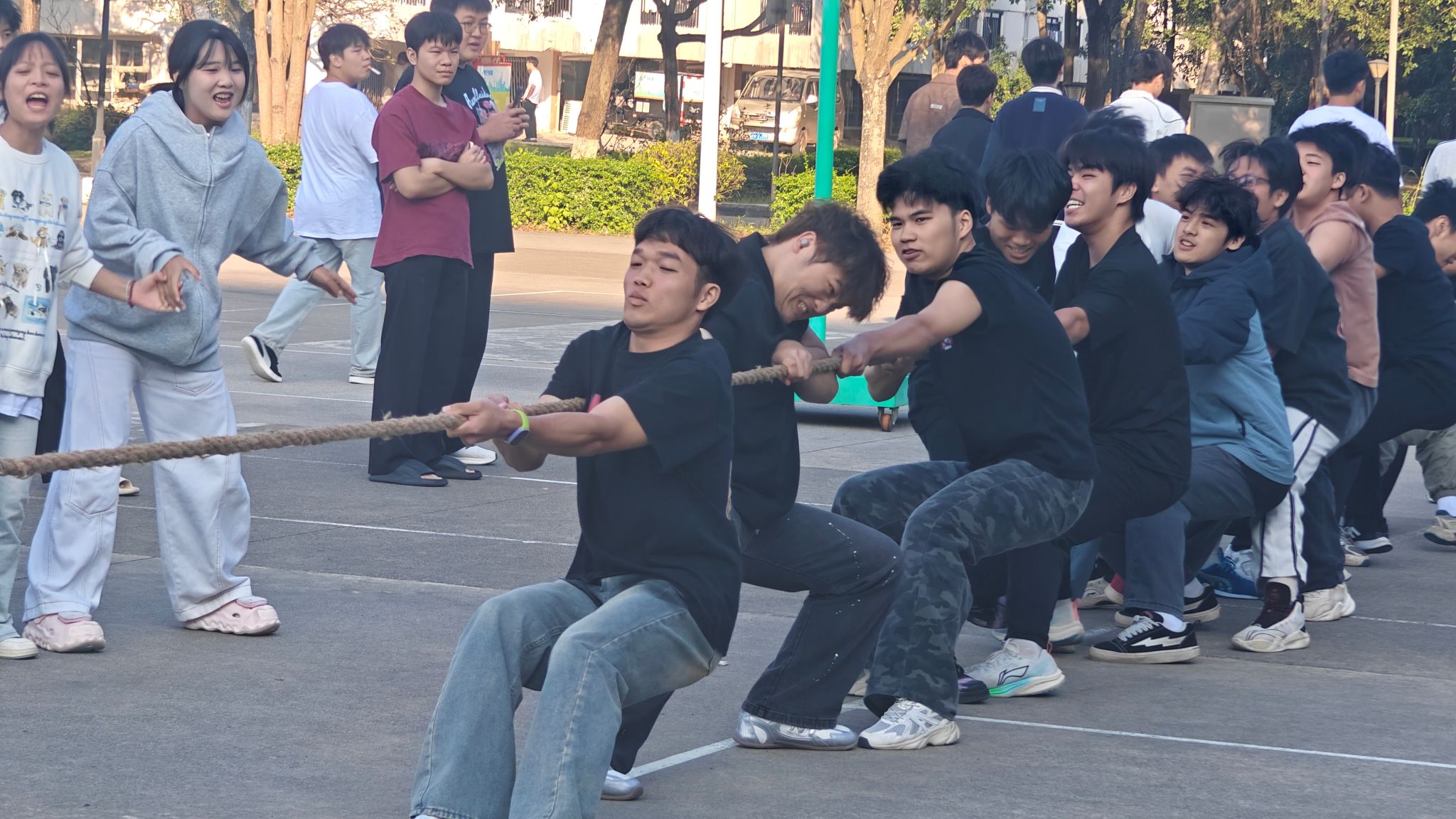 赛场上,一条长绳像磁石般吸住了所有人的目光,也将全场的力量拧成了一股绳。随着裁判员一声清脆的哨响,比赛正式拉开了序幕。霎时间,口号声、助威声、呐喊声此起彼伏,汇成一片欢乐的海洋。参赛队员们紧攥麻绳,马步扎得像根钉子,身体用力后倾,把全身的力气都灌进了手里的长绳里。长绳中点的红绸带忽左忽右地晃荡,揪着场上场下每一个人的心弦。