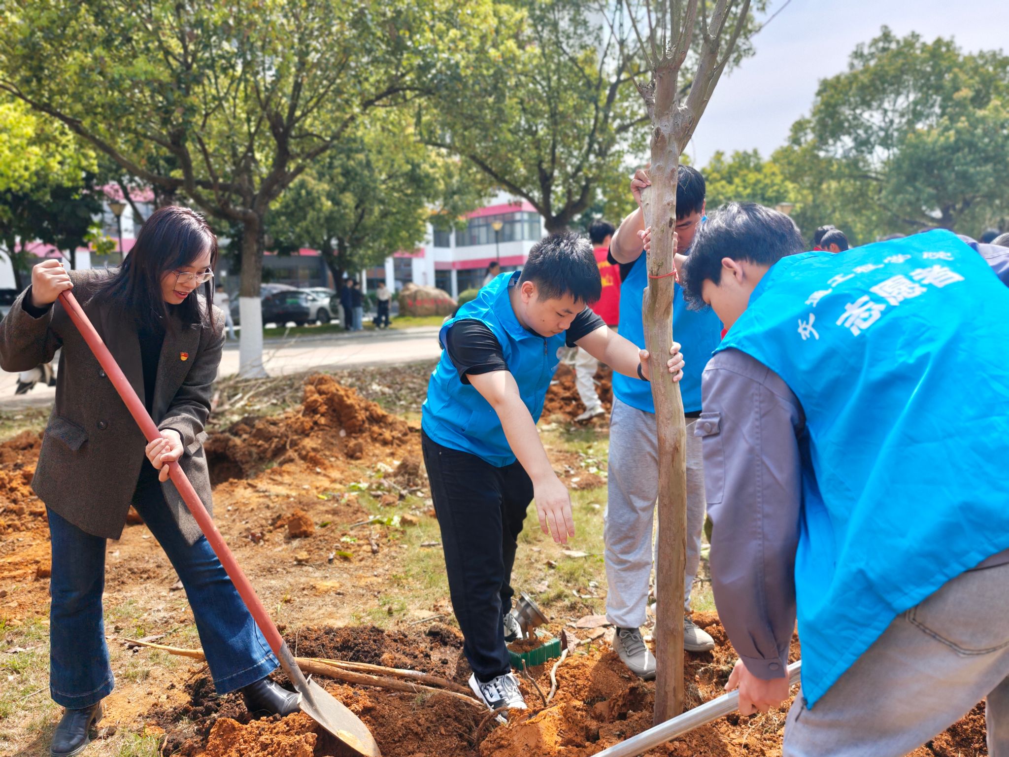 植树现场,党员教师率先垂范,与团员青年分工协作,手持铁锹、挖坑填土、提桶浇灌,分区域进行栽植,各环节衔接有序、有条不紊。和煦春光中,一株株新栽的树苗迎风挺立,为校园增添了盎然春意。