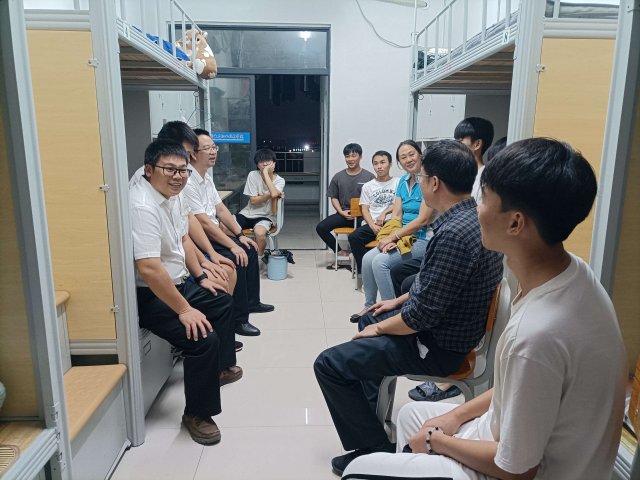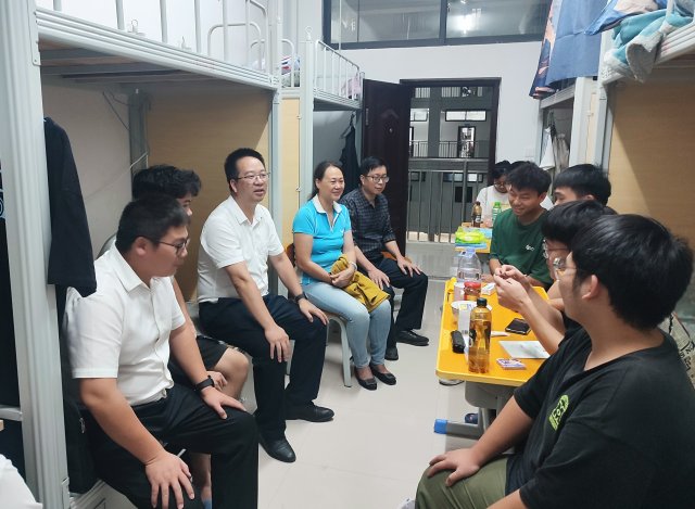 [本网讯]为深入了解新生的入校状况,加强师生交流,切实解决学生所遇到的实际问题,引导新生尽快适应新生活、新环境。10月18日晚,学校副校长周涛、基建处处长黄飞华、学工处处长李晓红、交通工程学院党总支书记张海明及2023级辅导员深入走访2023级新生宿舍,关心慰问2023级新生,了解学生的思想、学习、生活等情况。