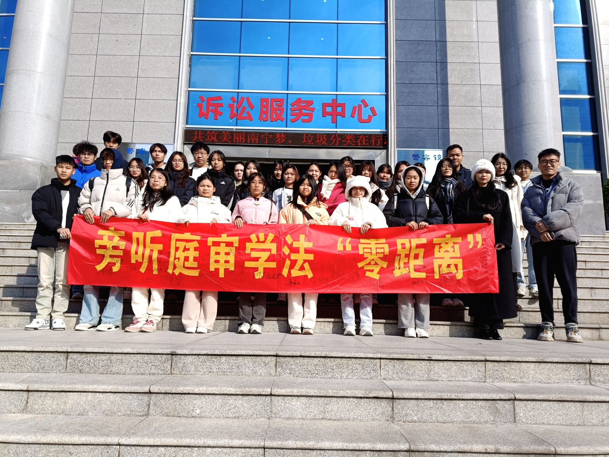 [本网讯]为深入学习宣传贯彻习近平法治思想,增强青年大学生法治观念,结合《思想道德与法治》课程教学的需要,12月22日上午,马克思主义学院教师杨华组织23级电子商务3-4班学生代表32人赴南宁市青秀区人民法院旁听庭审,“零距离”接触真实的司法审判,“沉浸式”学习法律知识。