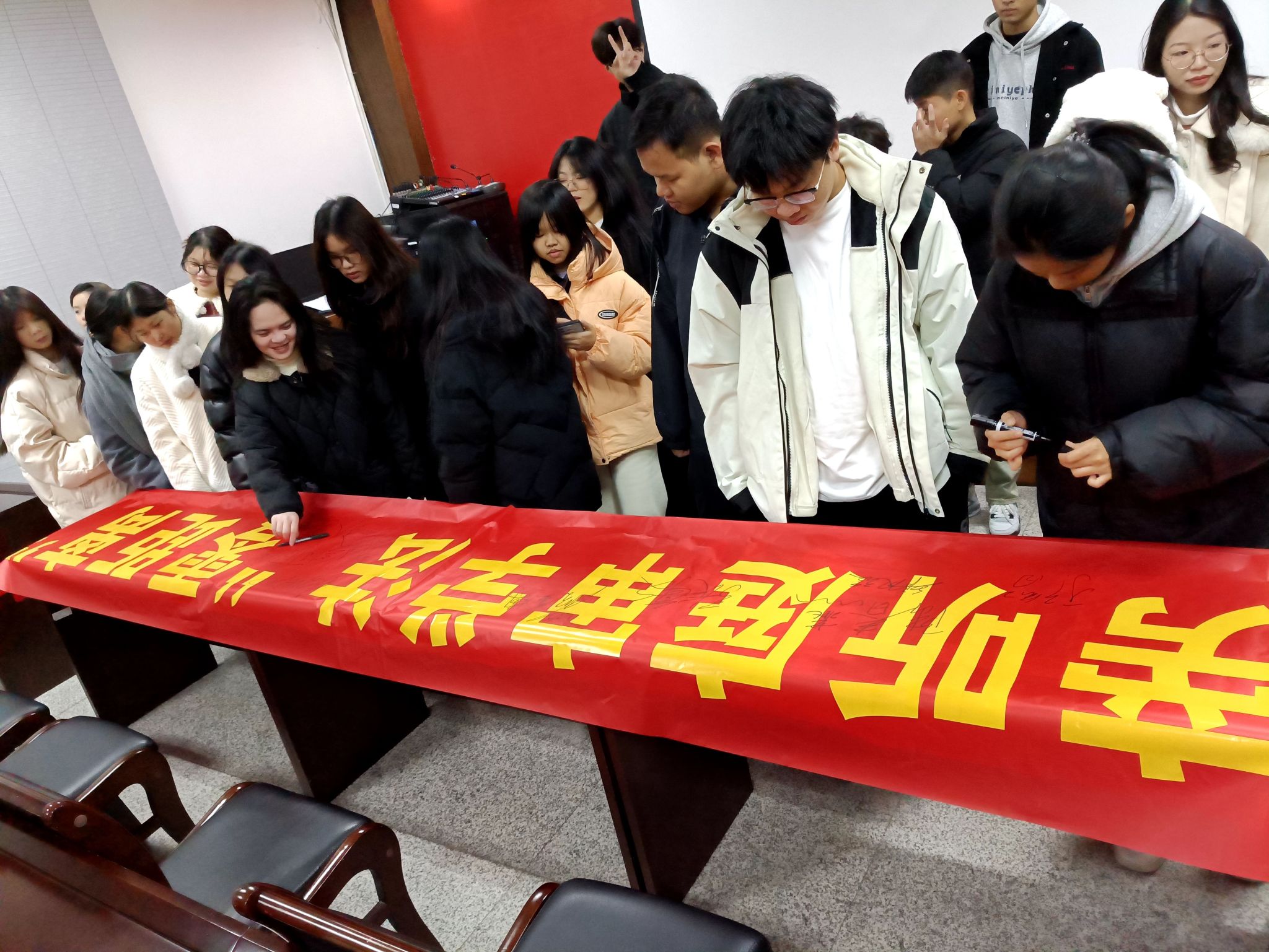 同学们在横幅上签名
