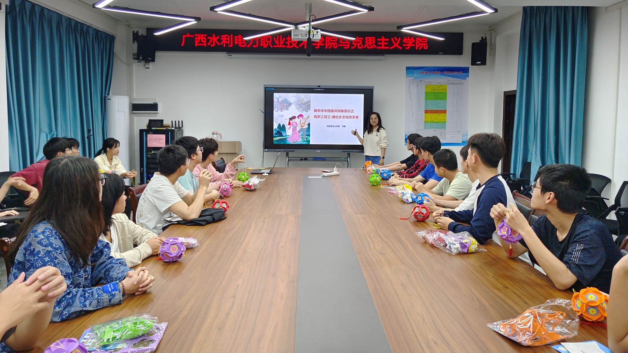 [本网讯]为进一步铸牢中华民族共同体意识,推动中华民族优秀传统文化创造性转化创新性发展,传承壮乡民族节日文化,增强民族文化自信,4月8日,马克思主义学院教师符敏在长堽校区马克思主义学院会议室组织开展“铸牢中华民族共同体意识”系列主题活动,本期的主题是“情系三月三  做壮乡文化传承者”。信息工程学院2023级物联网(平台应用与开发)班级40名同学参加了本次活动。