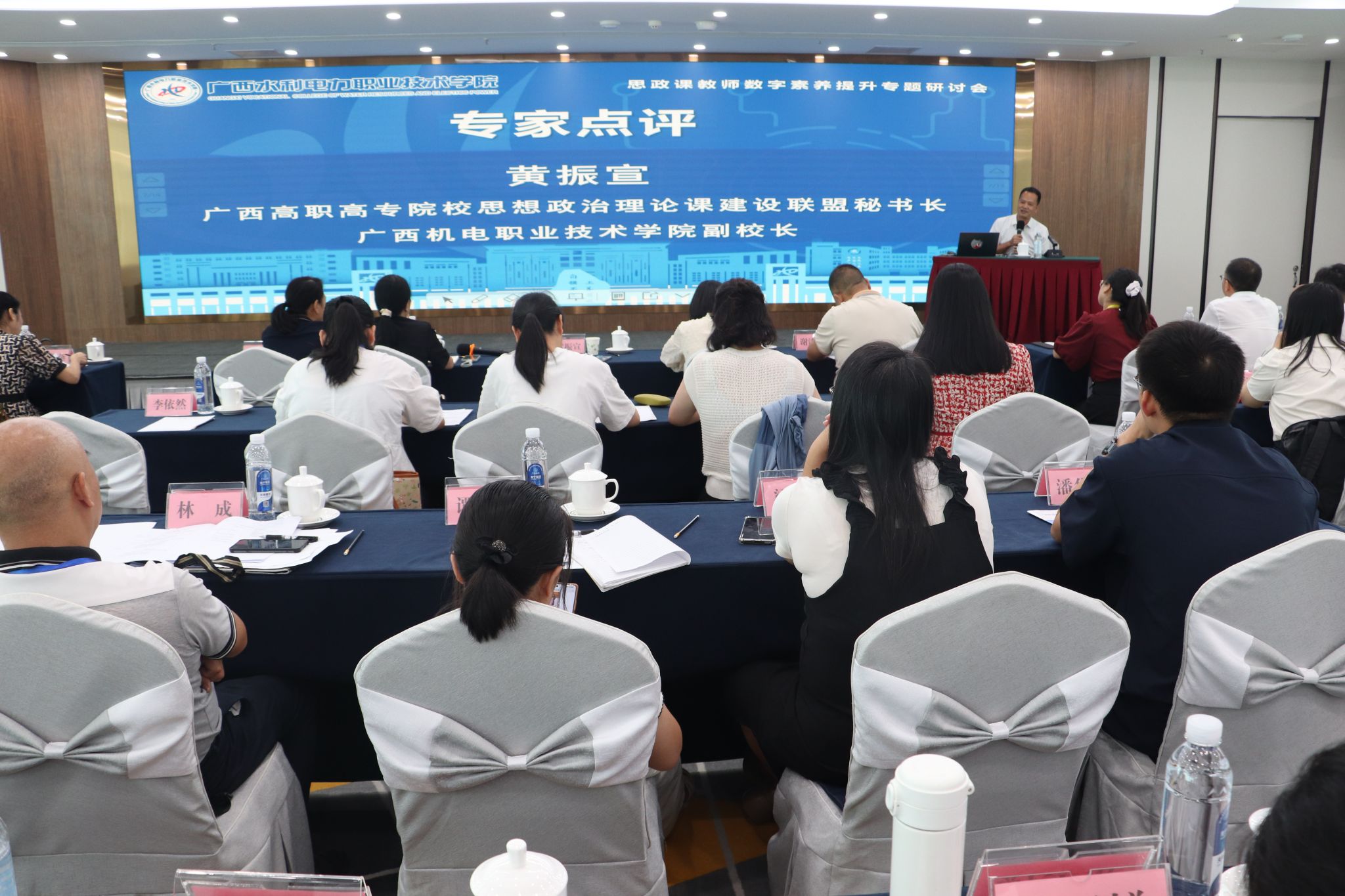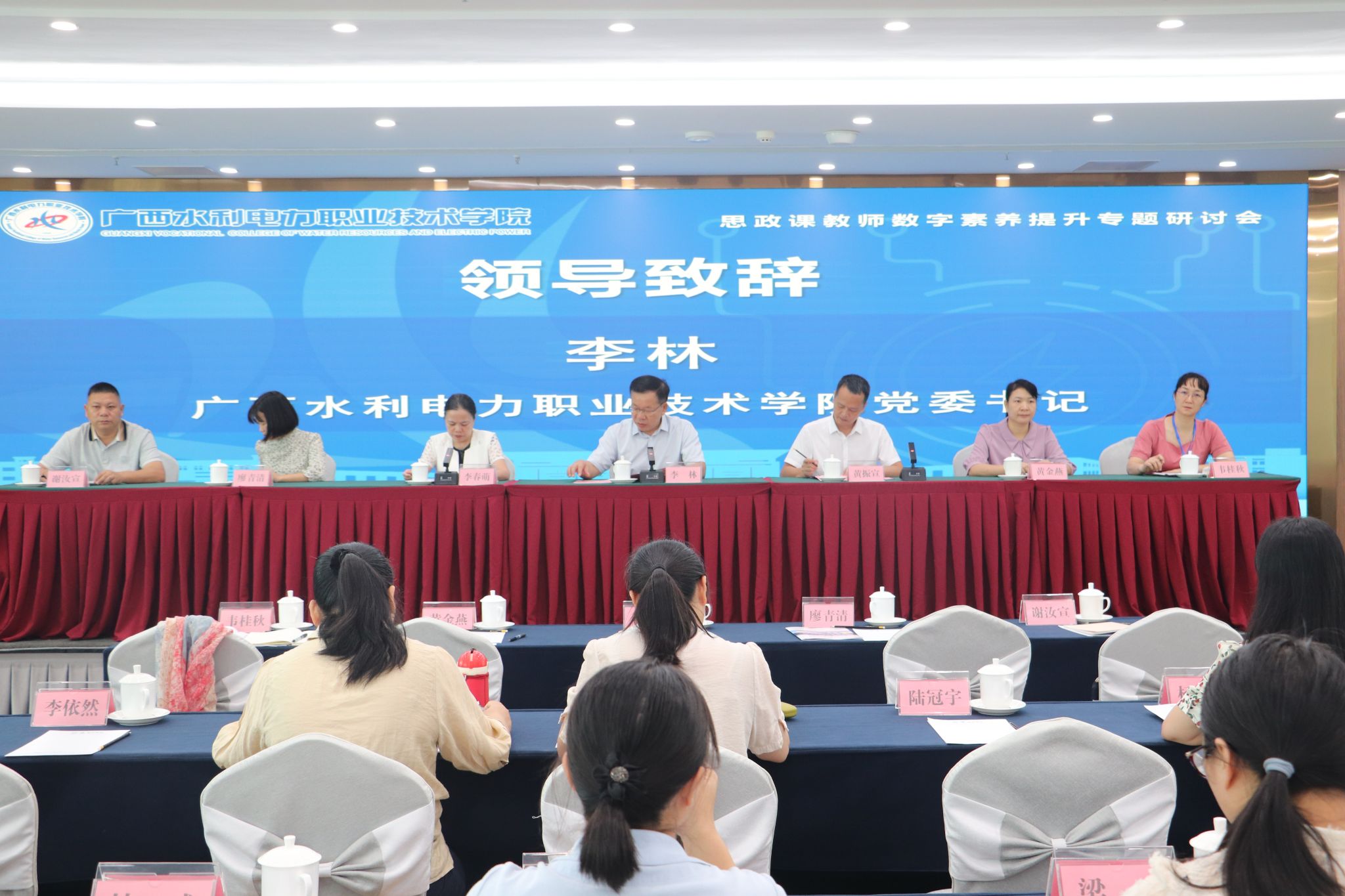 [本网讯]8月24—26日,“思政课教师数字素养提升”专题研讨会在南宁召开。会议由广西高职高专院校思想政治理论课建设联盟主办、我校承办、南宁职业技术大学协办。我校党委书记李林、广西高职高专院校思想政治理论课建设联盟秘书长黄振宣出席会议并致辞。我校马院院长李春萌主持会议。