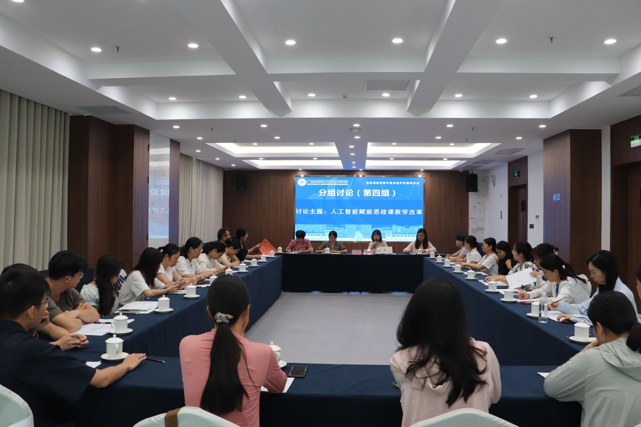 教学展示环节,来自职业本科、高职高专、中职等不同学段的10位教师分别围绕“AI 赋能思政课教学改革”主题,选取相关课程知识点进行展示。联盟秘书长黄振宣教授对选手们进行了细致专业而全面的点评,分享了宝贵的改进建议和实践经验,为与会教师提供了有益启发。在分组讨论环节,与会教师分成四个小组,围绕人工智能赋能思政课教学改革的经验与做法、存在的问题及对策建议等议题展开热烈讨论。