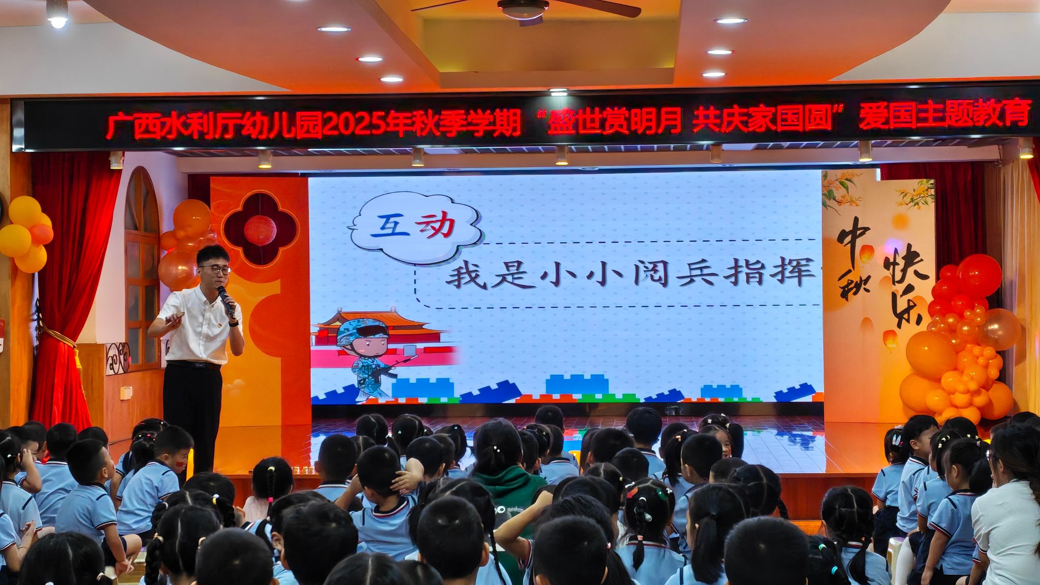 本次共建活动分两大环节有序开展。第一环节围绕“童心向党,伴我成长”主题,与幼儿园小朋友互动交流。马克思主义学院党员代表、水利厅“优秀青年宣讲干部”杨华以“回顾九三阅兵”为切入点,面向200余名小朋友开展知识问答。他巧妙设计“小小阅兵指挥官”“红星闯关记忆赛”“红色寻宝大发现”等互动游戏,充分调动孩子们的学习兴趣与参与热情。活动中,杨华还生动讲述广西抗战英雄事迹与新时代好少年故事,活动在全体共唱国歌的激昂氛围中推向高潮,让爱国情怀深深植根孩子们心中。