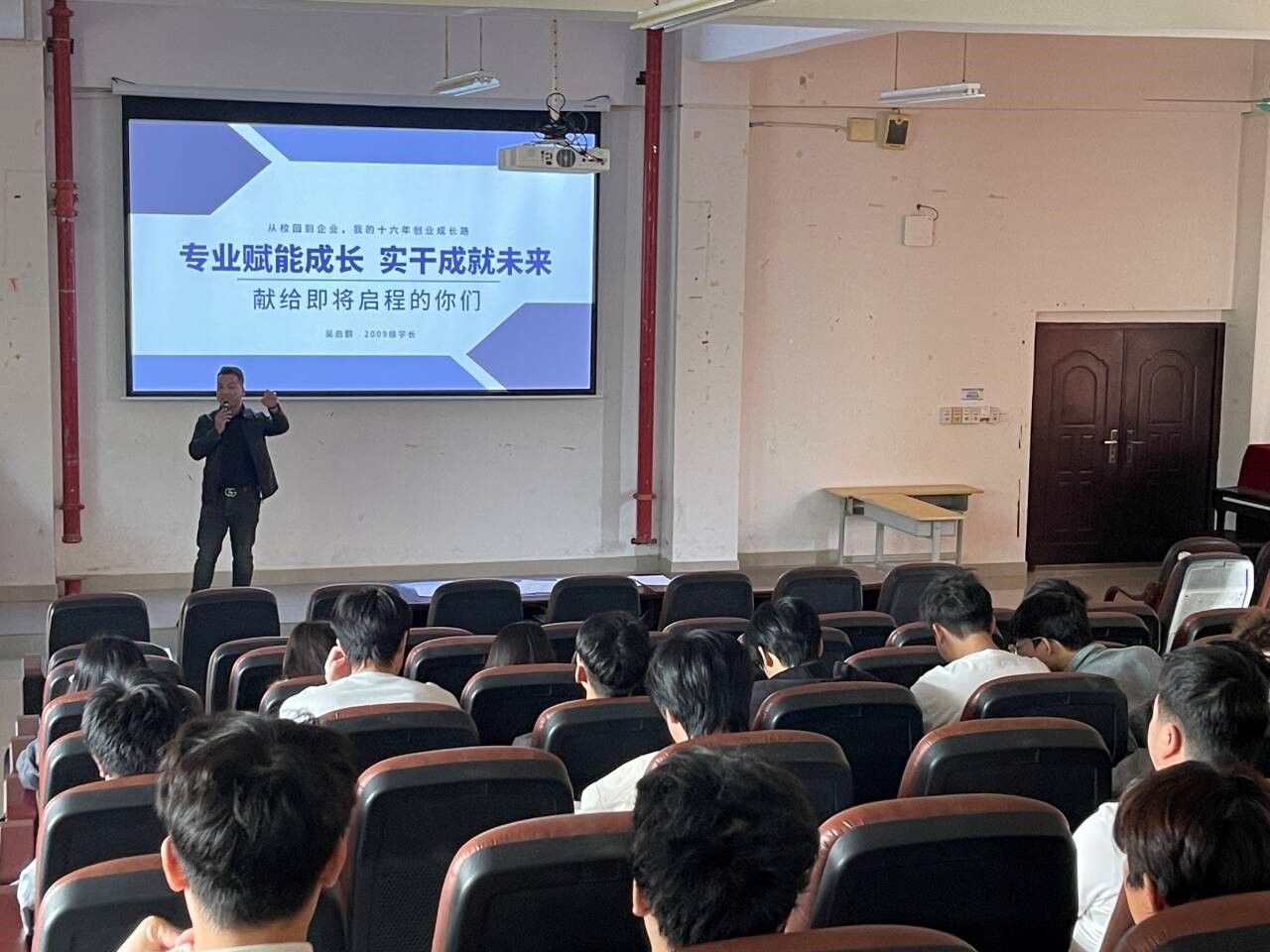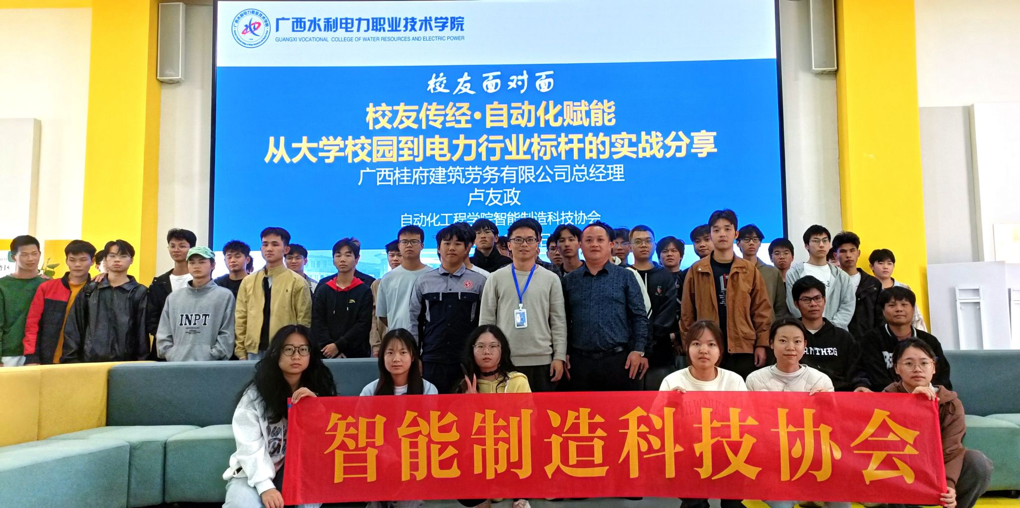 [本网讯]为搭建校企协同育人桥梁,分享行业实践经验,激励学子成长成才,2025年11月28日,自动化工程学院特邀2012届优秀校友、广西精邸家居有限公司总经理吴启鹏,为2024级、2025级建筑电气工程技术等专业学子带来《专业赋能成长·实干成就未来》专题讲座。学院楼宇智...