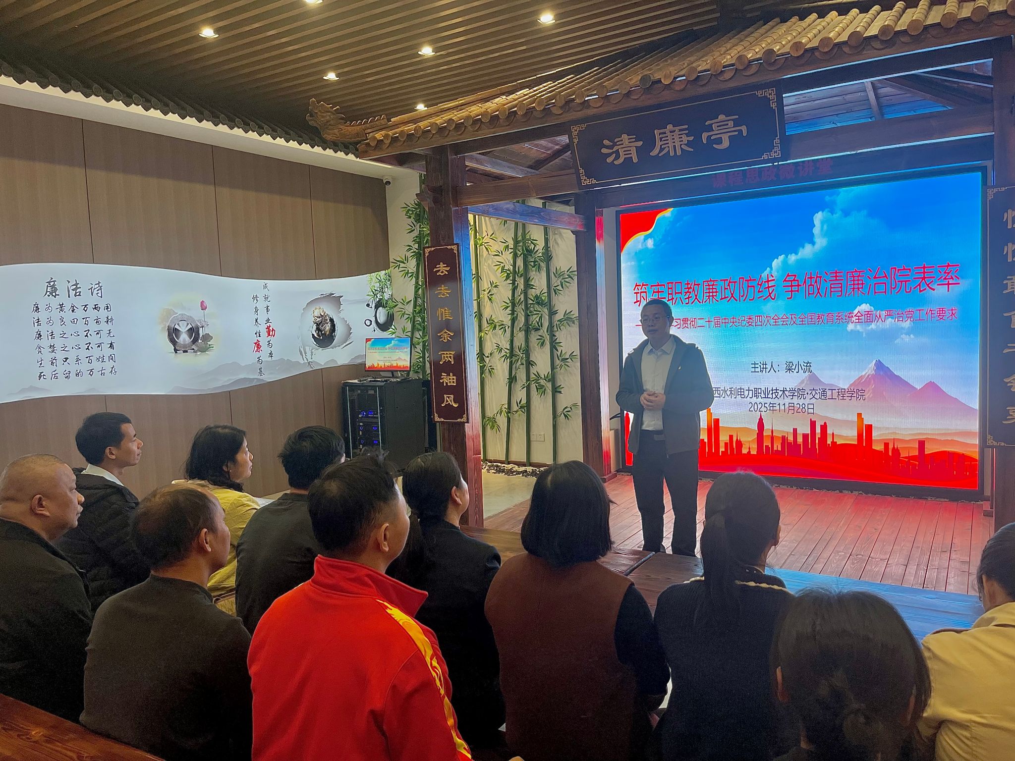 [本网讯]11月28日,交通工程学院教工党支部组织学院30余名教职工前往学校党风廉政与师德师风教育基地,开展以“筑牢廉政防线,提升文化内涵”为主题的党日活动。此次活动旨在深入推进学院党风廉政建设与师德师风教育,强化教师廉洁从教意识,学习借鉴其他学院文化建...