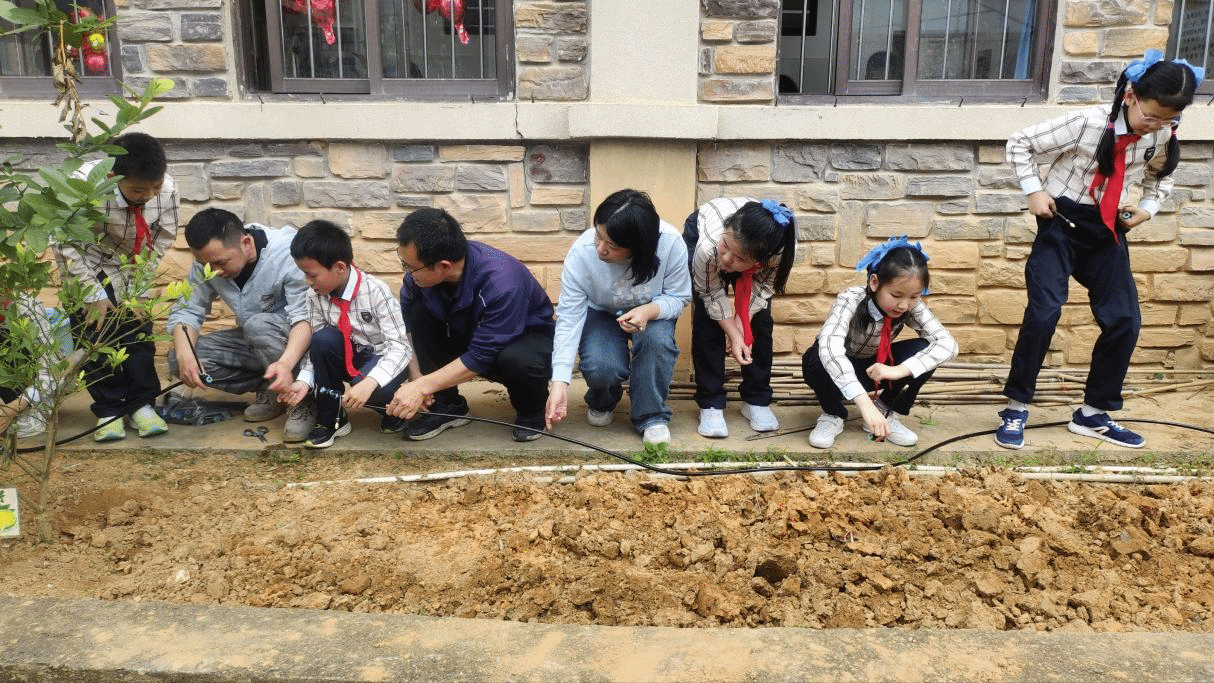 党员教师们指导孩子们设计组装喷灌系统