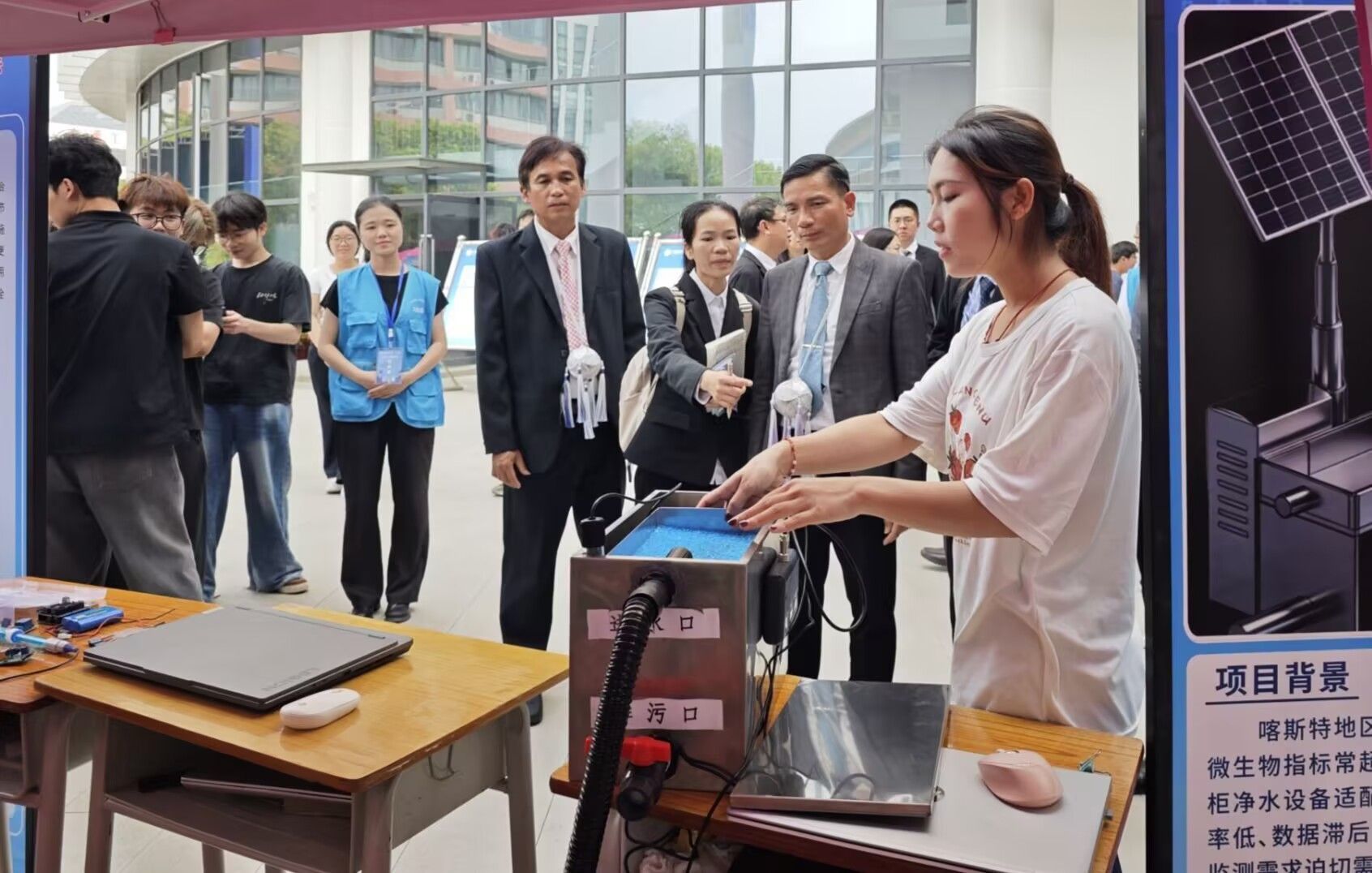 活动现场,吴萍老师指导的《菌酵农废・绿循乡村》项目团队,向师生代表展示了基于聚谷氨酸应用的落叶循环移动式堆肥装置。该项目通过创新性微生物发酵技术将落叶转化为有机肥料,实现绿色循环。团队成员详细讲解了装置的工作原理与试验成果,展现了科技赋能节水护水的创新路径。