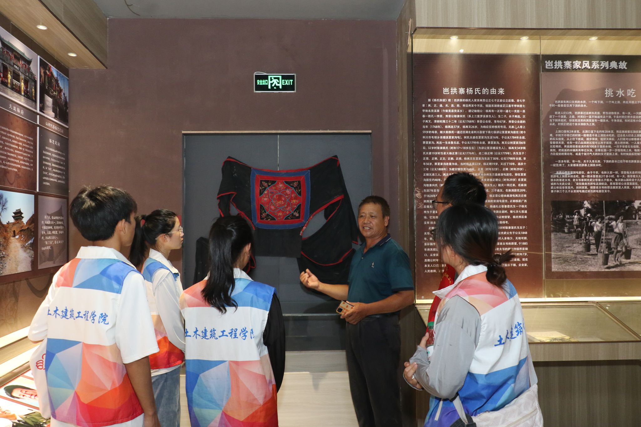 本年度“三下乡”活动围绕“中华文化传承”核心内容开展红色文化、清廉家风、非遗技艺、民族团结、乡村文化建设六个专题的活动开展。鲁班志愿服务队成员发扬“鲁班工匠精神”,不怕苦不怕累,跟随驻村干部走遍乡村的每个角落,深入农户家了解农户生产生活情况、进行政策解读,给村里老人们包爱心饺子,帮助村民收稻谷、建禽舍,让村民们感受不同民族的青年们团结在一起,包围在民族团结的同心圆里。成员们参与村委会的乡村建设会议,了解村情;参与乡村文化建设的工作,助力乡村振兴。同学们来到金城江区河池镇国家重点文物保护单位红军标语楼和红军第七军第八军河池整编阅兵纪念馆进行研学,感受先辈们英勇奋战不怕流血牺牲的铮铮傲骨,被先辈们一个又一个英勇事迹感染。眼前一个个斑驳的文物无不是在告诉后人们,当年是怎么样的环境下奋力抗争依然坚信黎明能够到来。驻村干部组织同学们参观弘农家风馆,在家风馆进行清廉家风的学习;家风连国风,国风兴家风,青年一辈牢记建好家风清廉为伴。同学们结合自身专业特色,在村里开展了扎染非遗技艺和民族建筑榫卯工艺展示。让村民们在家门口就能了解扎染技艺、民族木构技艺增长见识,助力乡村文化建设。