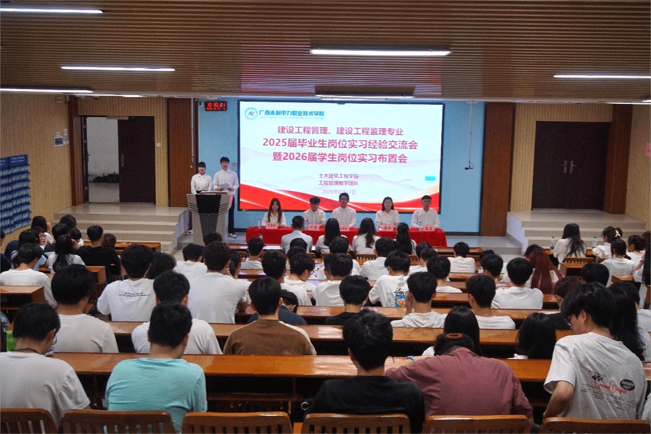 6月27日上午,土木建筑工程学院建设工程管理教学团队在里建教学楼阶梯教室101召开2025届毕业生岗位实习经验交流会暨2026届毕业生岗位实习布置会。教学团队负责人陶丹、建设工程监理专业负责人解双、就业干事韦凯杰、辅导员梁春艳、苏健以及2023级建设工程管理、建设工程监理专业全体学生参与会议。