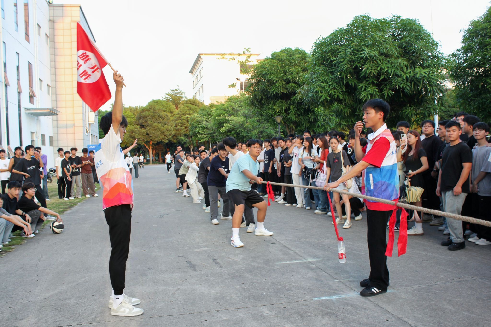 比赛现场,红色绳索横跨赛场,各班队员紧握绳柄、身体后倾,眼神坚定望向同一方向。随着裁判哨声响起,助威声、呐喊声瞬间响彻校园——“一二!加油!”的口号整齐划一,2025级新生班级辅导员们与未参赛班级同学组成助威方阵,有的踮脚呐喊、有的拍掌鼓劲,甚至跟着节奏跳动,将现场气氛一次次推向高潮。面对强劲对手,运动健儿毫不退缩,有的班级在绳体僵持时齐声喊号、凝聚力量;有的班级在比分落后时咬牙坚持、逆势翻盘,最终25建装2班凭借顽强斗志斩获冠军。汗水浸透运动服,手掌磨出红痕,此刻民族体育的协作精神与青春的热血在此刻交融。
