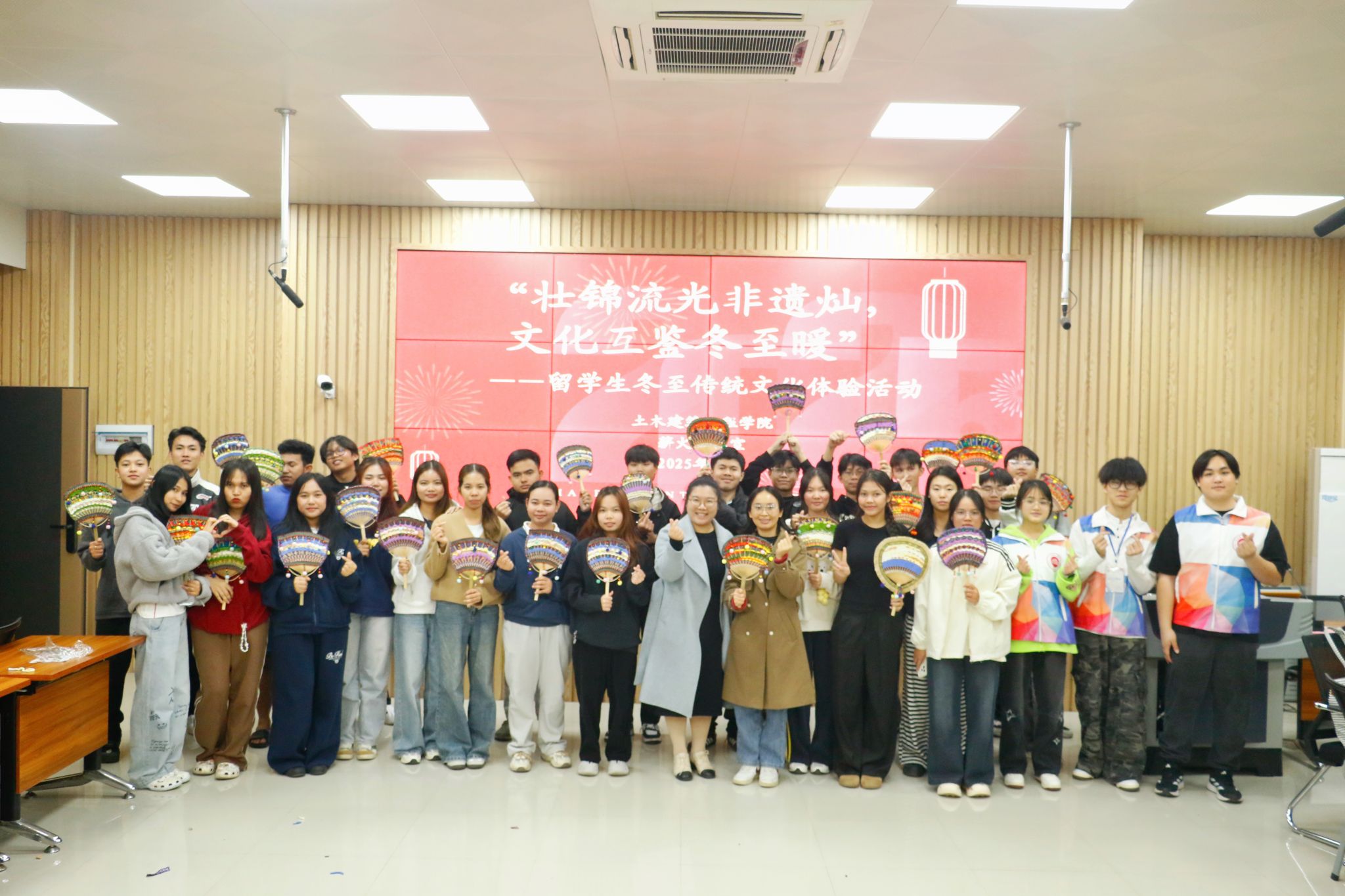 [本网讯]为彰显壮锦非遗文化魅力,深化中外文明交流互鉴,恰逢冬至佳节将至,12月11日晚,土木建筑工程学院于里建校区建筑实训楼202教室成功举办“壮锦流光非遗灿,文化互鉴冬至暖”主题留学生传统文化体验活动。活动由学院团委联合薪火辅导员工作室牵头组织,邀请电力工程学院30余名在校留学生沉浸式体验壮锦扇制作,让异国学子在指尖勾勒经纬、巧筑纹样的过程中,亲身感受中华优秀传统文化的深厚底蕴与温暖力量。学院院长助理李文娟、团委副书记梁春艳、薪火辅导员工作室覃荣坚、教师代表江柯燃出席活动,团委书记莫潇娉主持活动。