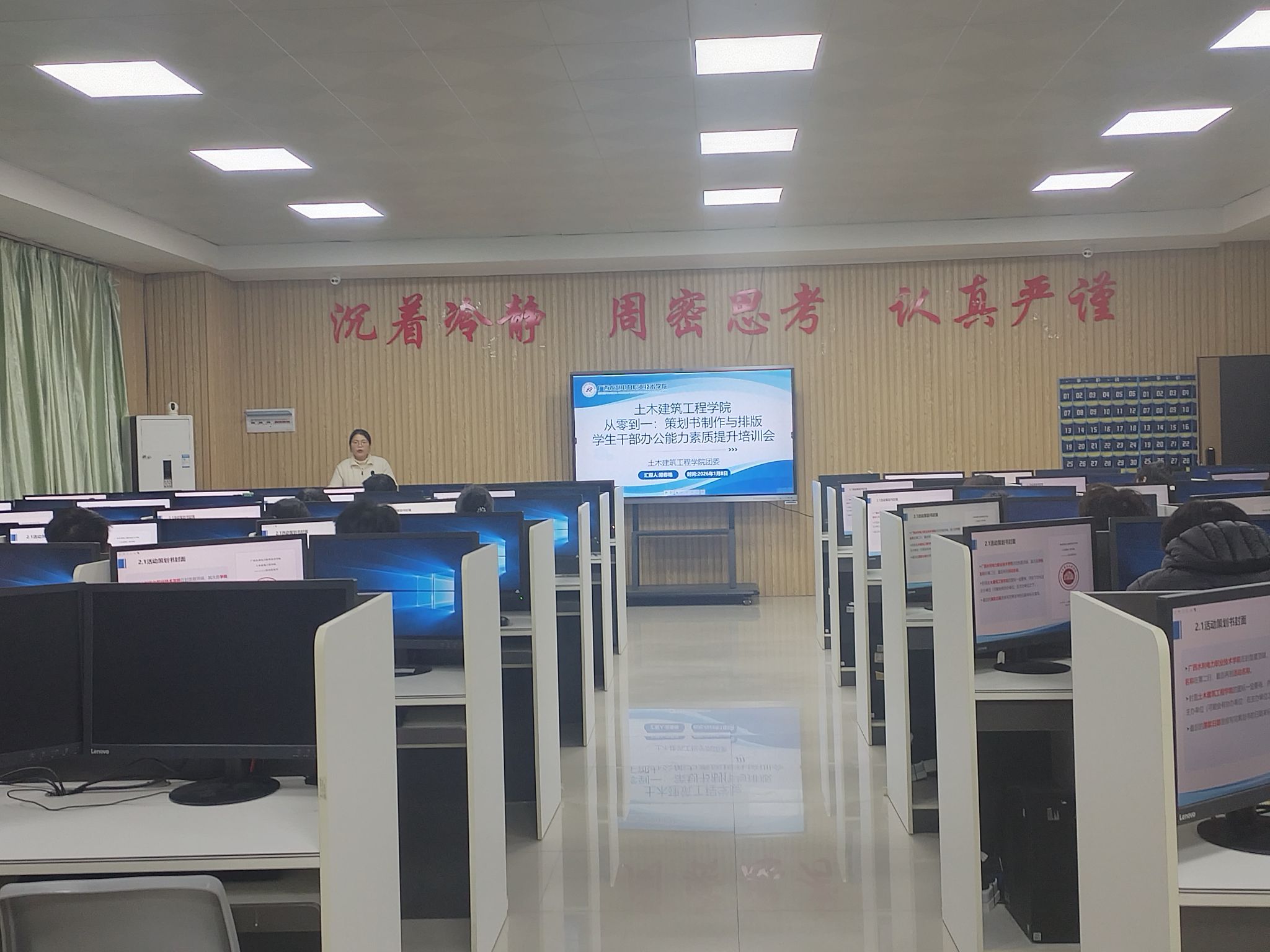培训会上,梁春艳结合团学工作实际场景,以“活动策划书文档制作与排版”为主要内容,通过理论讲解、案例分析与实操演示相结合的方式,系统讲解文档设计规范、对文档整理技巧及排版优化方法。大家纷纷表示,将把培训所学运用到后续工作中,以更专业的技能、更严谨的态度完成各项任务,为学院团学工作高质量开展贡献力量。