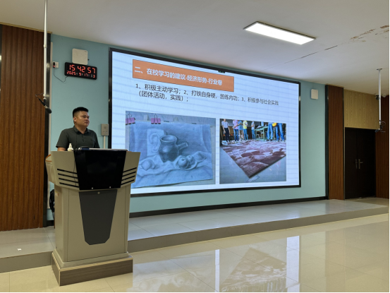 在备受关注的“薪火相传”环节,2022级的马超宇、韦春萍、龙志凯等几位学长学姐分享了他们的实习心得。他们结合在设计公司、施工企业等不同平台的经历,一致强调了“施工思维” 和 “客户沟通” 的重要性。学长学姐们指出,学校的理想化设计需要接受工地现实的检验,主动深入施工现场、学会与客户及项目团队有效沟通,是与掌握软件技能同等重要的核心能力。他们的分享真诚而“接地气”,为学弟学妹们提供了宝贵的前车之鉴。