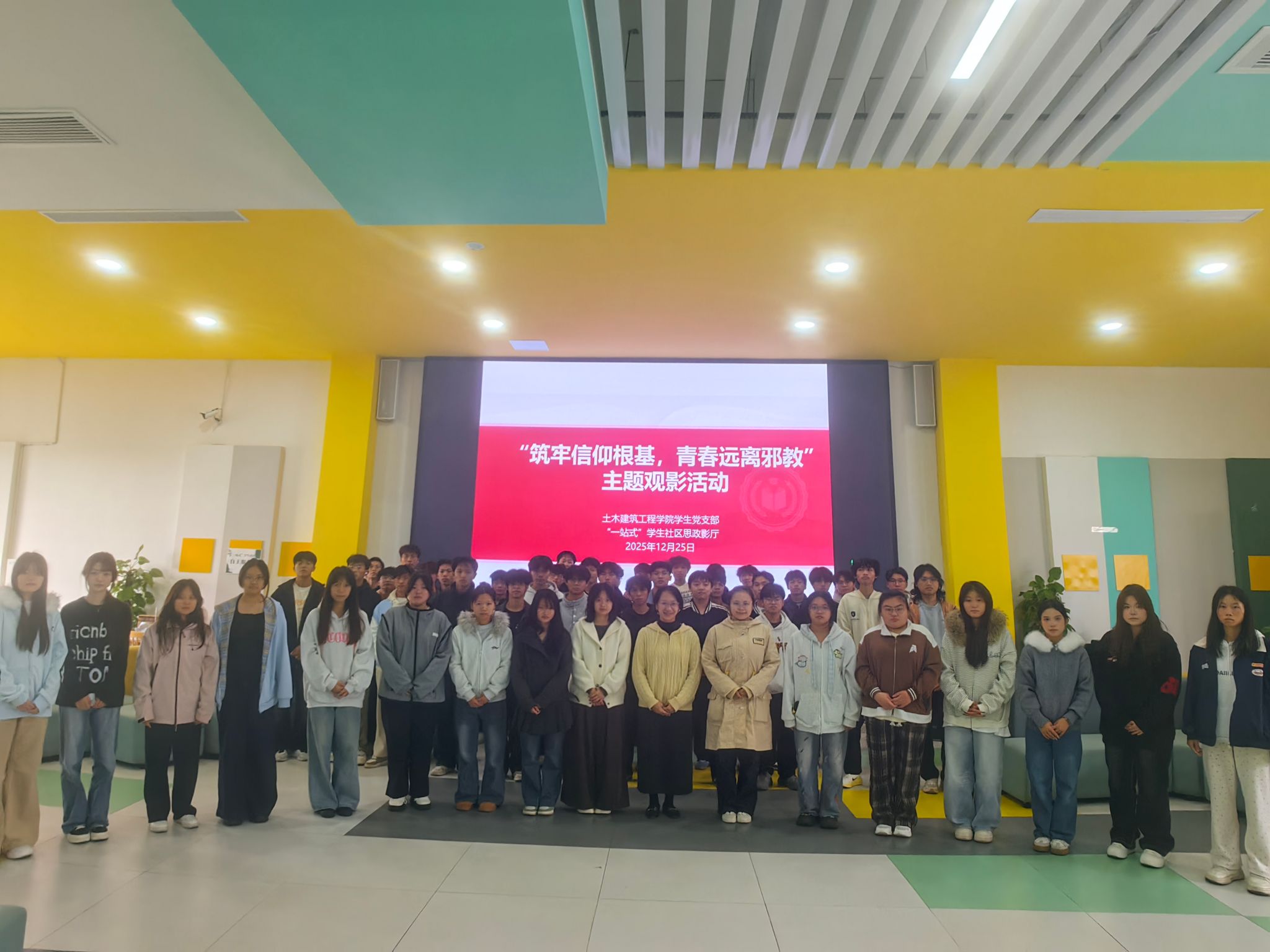筑牢青年学子抵御邪教侵蚀的思想防线,营造崇尚科学、健康向上的校园氛围,12月25日下午,土木建筑工程学院学生党支部在里建校区“一站式”社区思政影厅,成功举办“筑牢信仰根基,青春远离邪教”主题观影教育活动。支部宣传委员贾莉带队,52名学生代表共同参与此次活动。