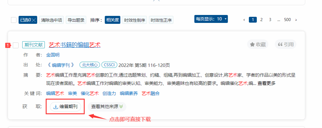 检索界面标有“维普期刊”标识的文献,点击即可直接下载到电脑上。标有其他数据库标识的,点击跳转到该数据库下载。