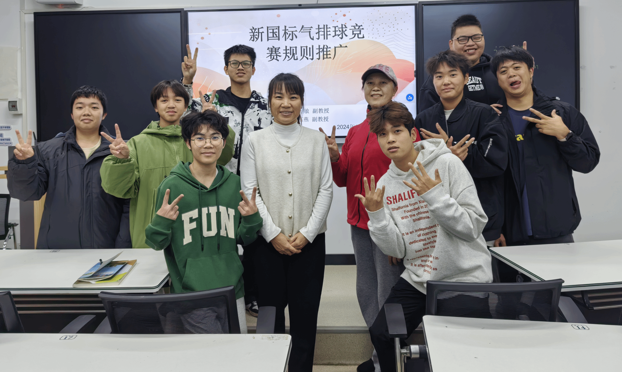[本网讯] 12 月13 日晚,学院在长堽校区第四教学楼103举办新国标气排球竞赛规则推广培训讲座,由梁旭敏、韦菡燕两位副教授主讲。本次讲座旨在普及气排球知识,提高学生对新国标气排球运动的兴趣和技能。