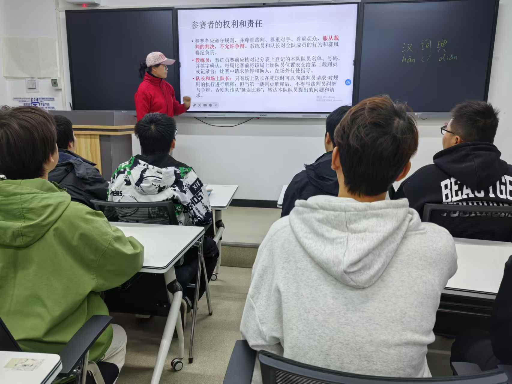 两位教师通过生动的讲解和精彩的示范,向学生们介绍了气排球的起源、发展、比赛规则以及基本技巧。激发了同学们极大的兴趣,同学们积极参与互动。在体验环节,学生们踊跃参加。通过理论与实践的结合,学生们不仅加深了对新国标气排球知识的理解,还提高了自己的临场执裁能力。