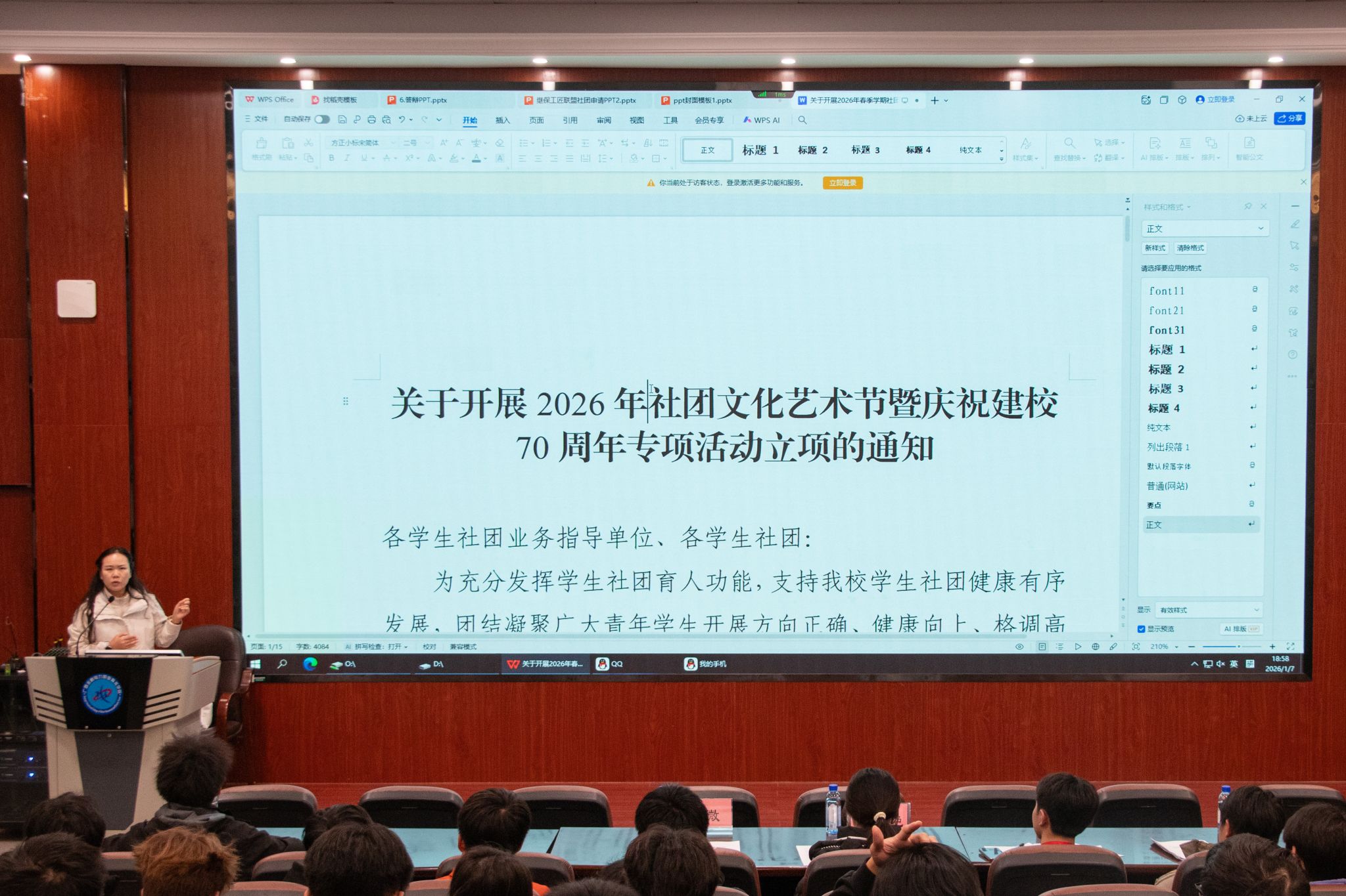 1月7日,校团委组织召开2025-2026学年秋季学期学生社团期末工作总结大会暨庆祝建校70周年专项活动立项工作布置会。分管社团工作的校团委韦微老师出席会议,全校45个学生社团负责人共同参会,谋划以社团青春活力献礼母校华诞。