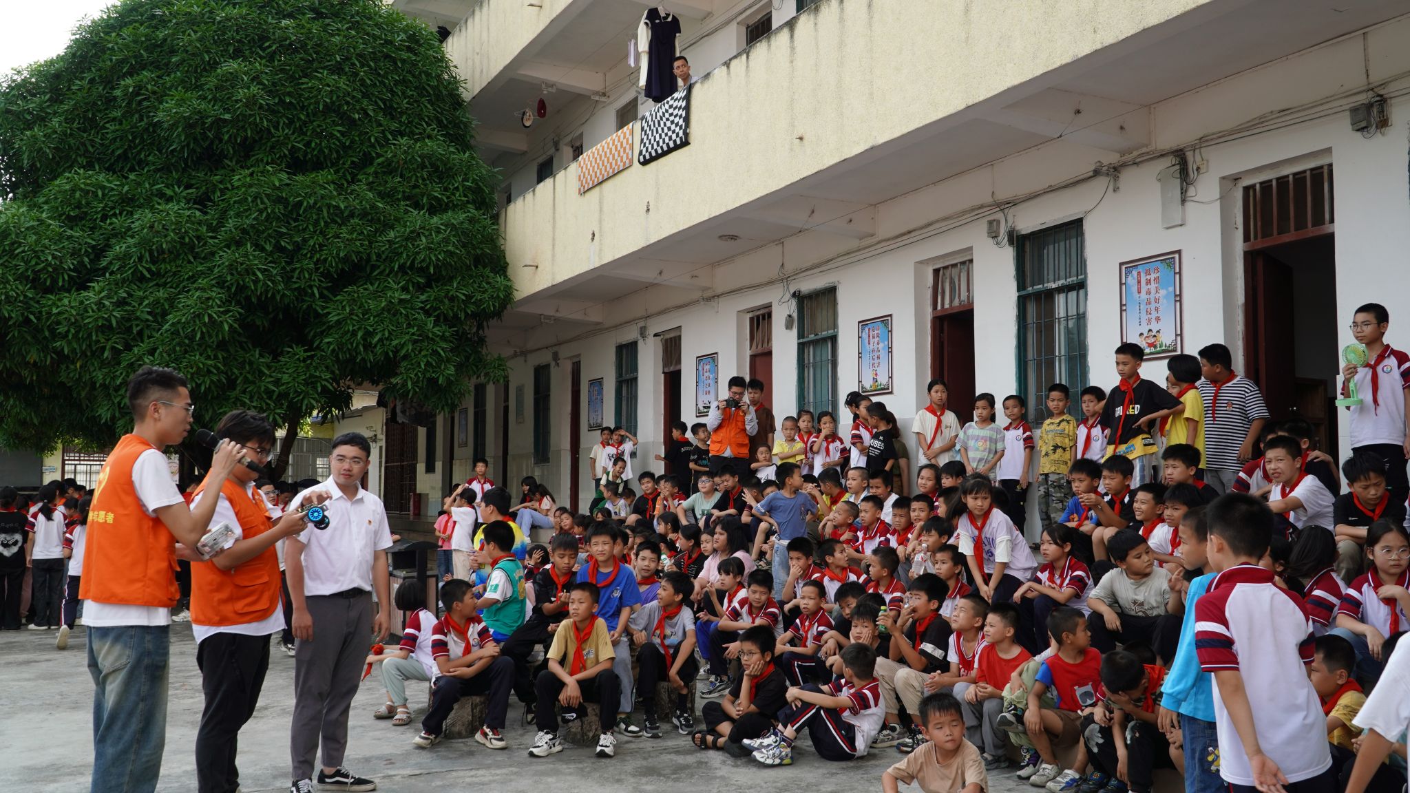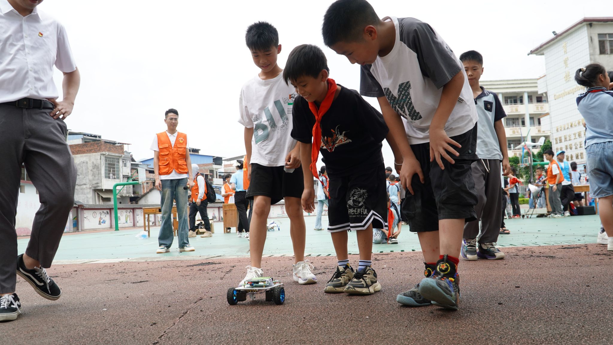在活动现场,小朋友们表现出浓厚的兴趣,纷纷围观询问,学院师生们耐心解答,演示了小车的操控方式和学生自制的音响设备,现场互动频繁,氛围热烈而融洽。
