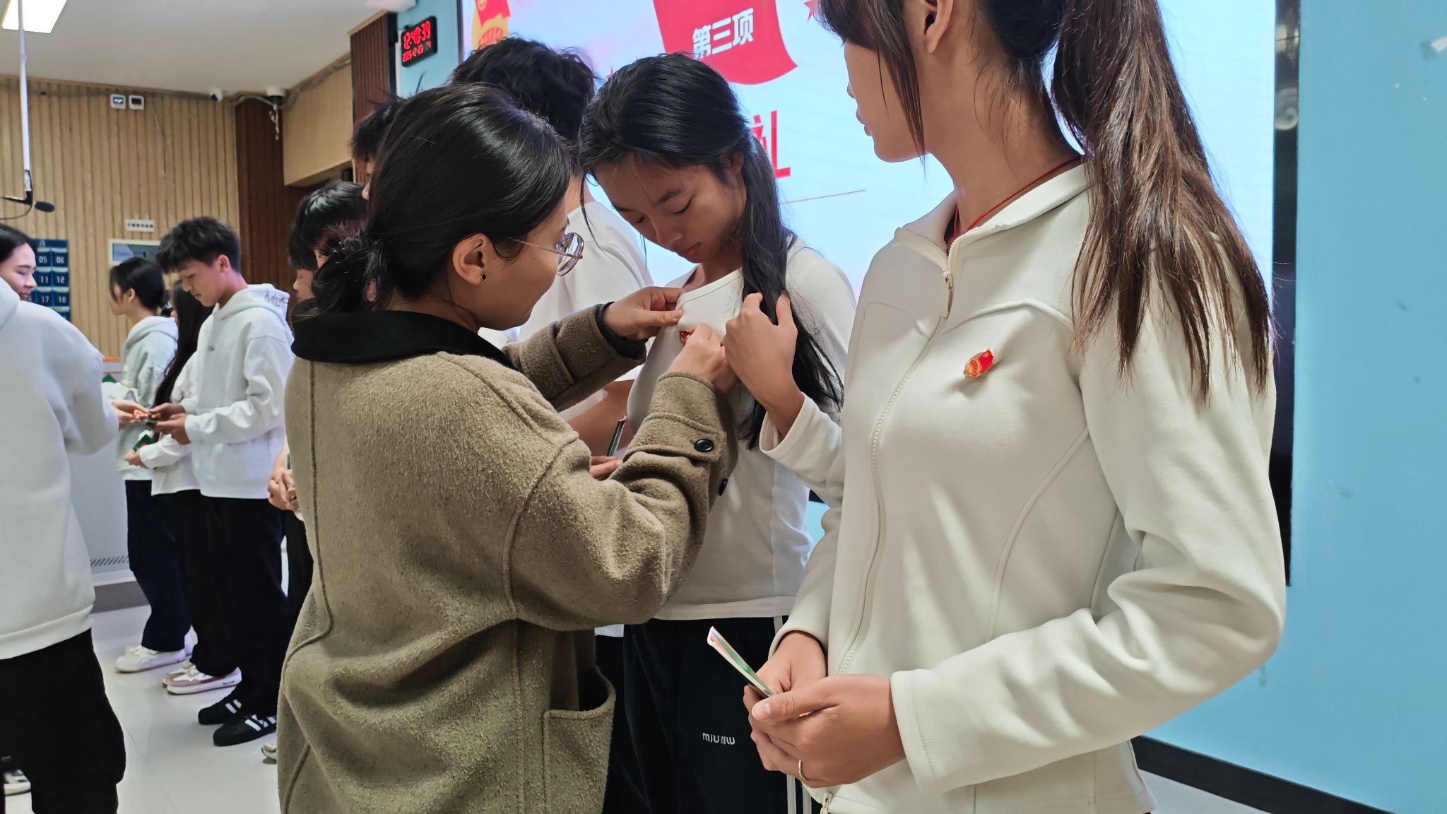 仪式在庄严的国歌声中拉开帷幕,现场氛围庄重而热烈。随后,教师代表们为新团员颁发团徽与团员证,崭新的团徽佩戴在胸前,标志着新团员正式加入共青团大家庭。新老团员代表先后发言,新团员代表表达了入团的激动心情与践行团员义务的决心,老团员代表分享了成长感悟,激励学弟学妹们勇担青春使命。